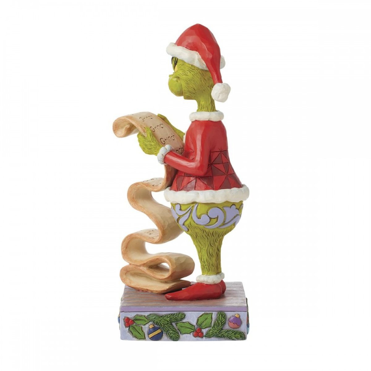 This figurine designed by Jim Shore features the Grinch dressed as Santa examining a long list of naughty and nice people. Plotting to ruin Christmas, the Grinch moves every name on the naughty list to make sure no one gets any presents this year. From the Grinch Collection, designed by award-winning artist and sculptor Jim Shore. Each figurine is hand painted and slight color variations are expected, making each piece unique. Packaged in a gift box. These items are not children's toys. Intended for adults only.