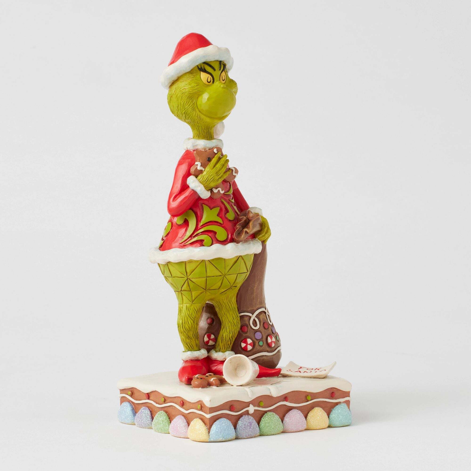 Dressed as Christmas Claus, with his sack ready to steal presents, The Grinch feasts on gingerbread and spills Christmas's milk. With its intricate detailing and signature Jim Shore designs, this figurine perfectly captures the Grinch's mischievous spirit. Designed by award-winning artist and sculptor Jim Shore for The Grinch Collection. These figurines are not children's toys. Intended for adults only. Height: 20.5cm
