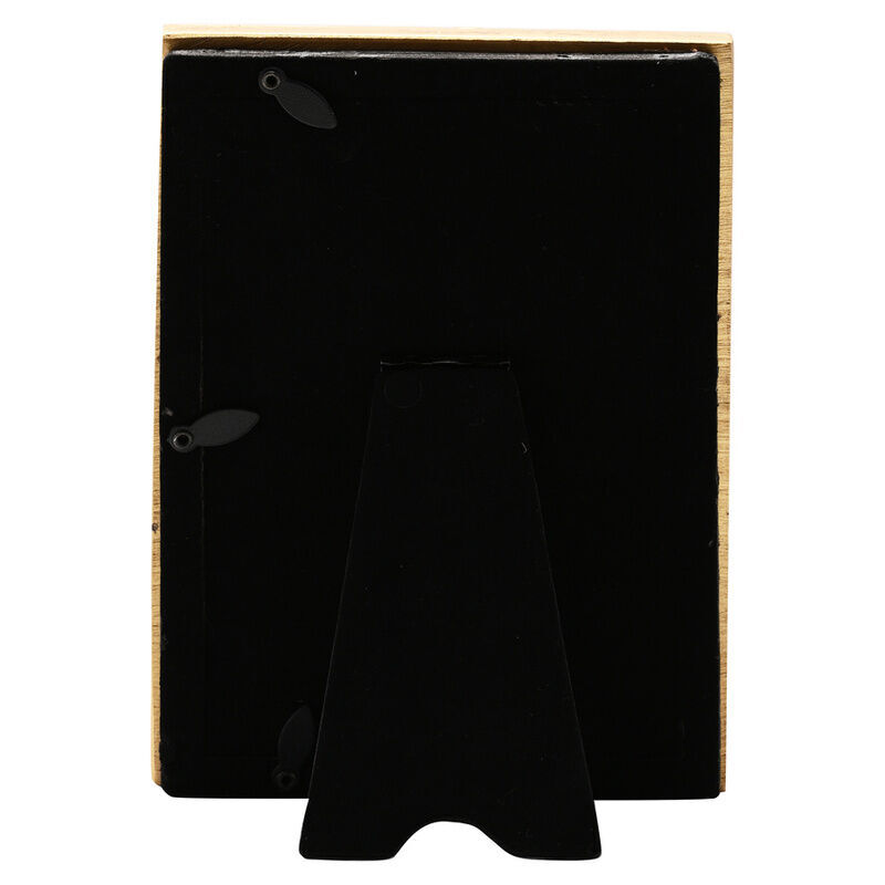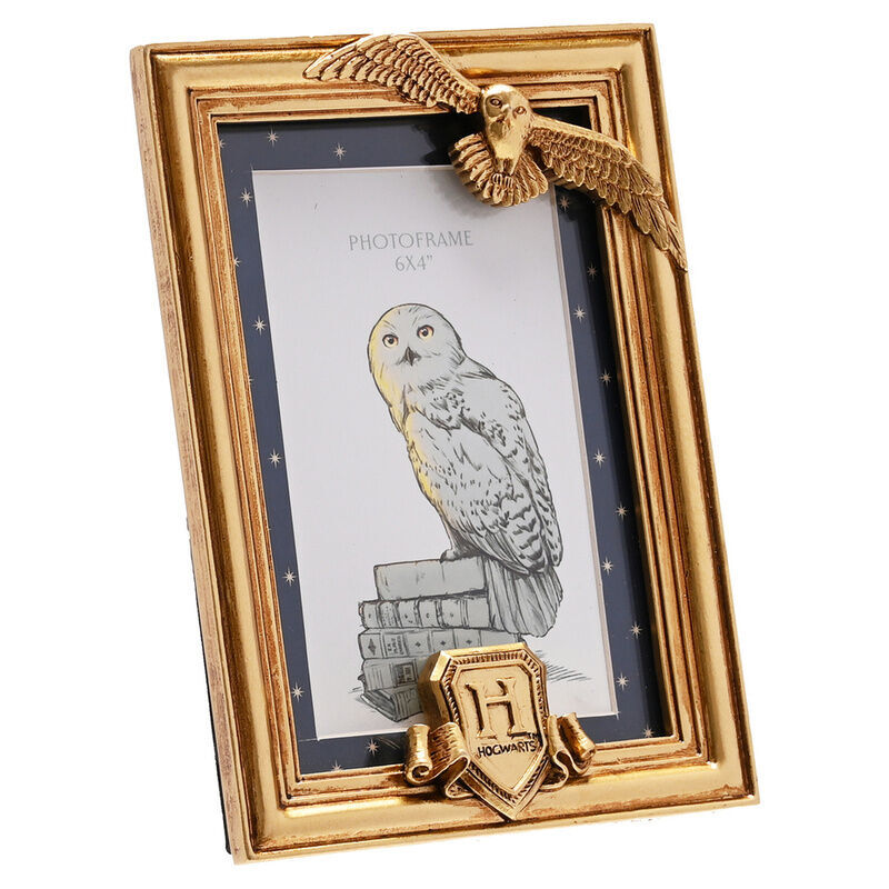 The portrait, gold resin photo frame showcases a metallic effect finish, complete with 3D Hedwig and Hogwarts crest embellishments. It is designed for display using the attached standing strut.