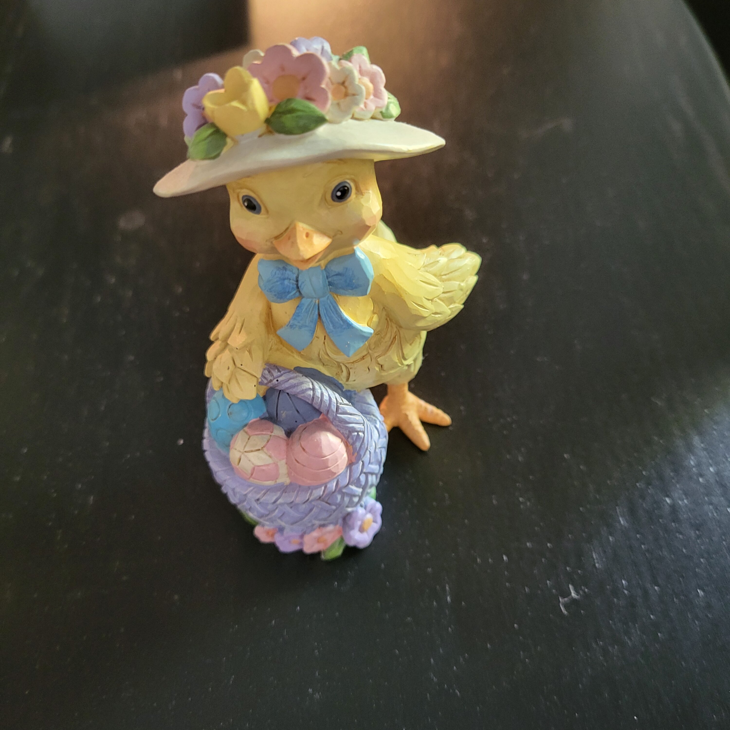 Mini Figurine of a chick with a bow and a flowered hat, collecting Easter eggs in its basket. Figure from the Heartwood Creek collection, designed by award-winning artist and sculptor Jim Shore. Each figurine is hand painted and slight color variations are expected, making each piece unique. Packaged in a gift box. These items are not children's toys. Intended for adults.