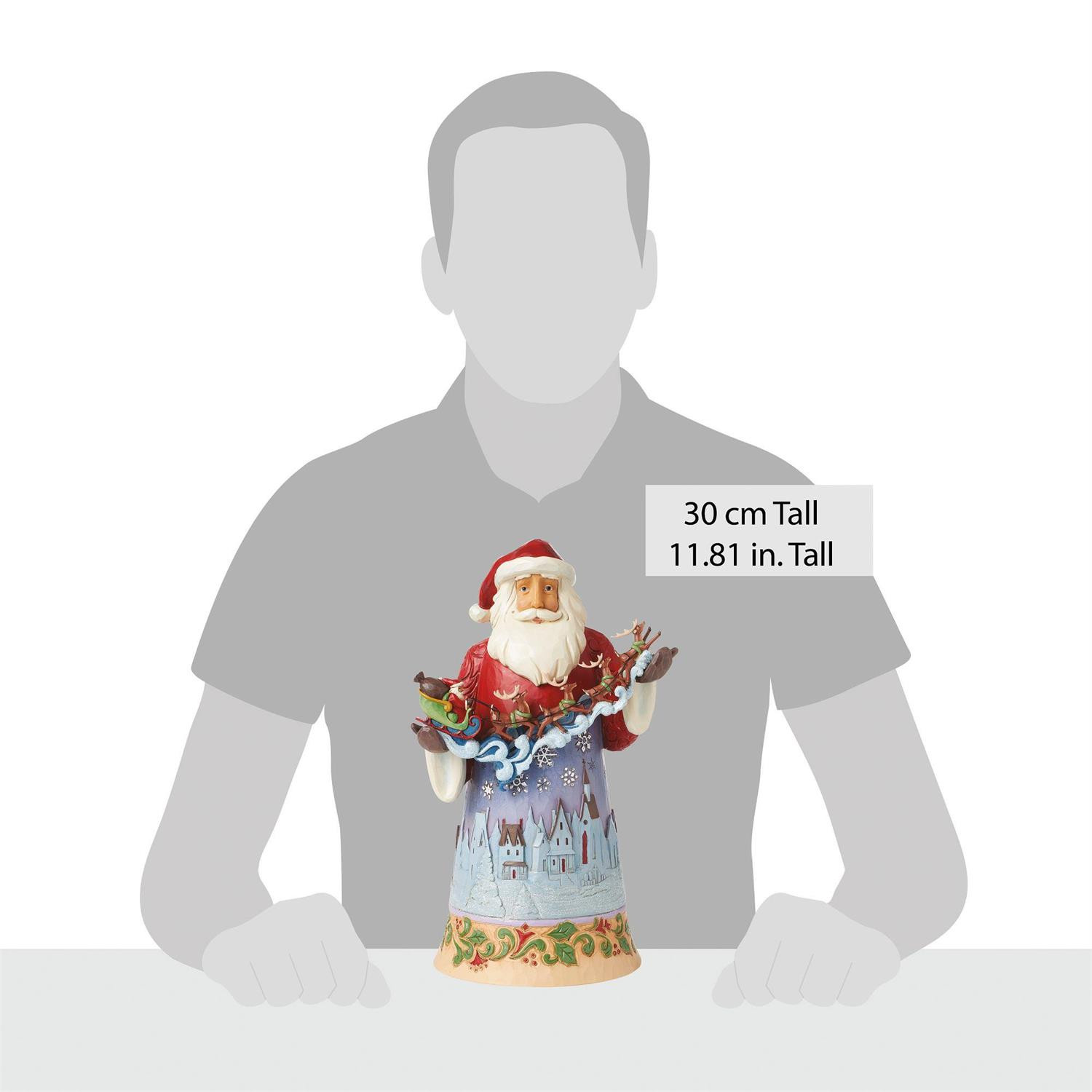 This Jim Shore Santa holds a miniature version of himself flying in his reindeer lead sleigh. With a scene of a snowy nighttime town on his robes, a scene of Christmas night is created. With rosemaling, flowers, and snowflakes, this figurine enchants.