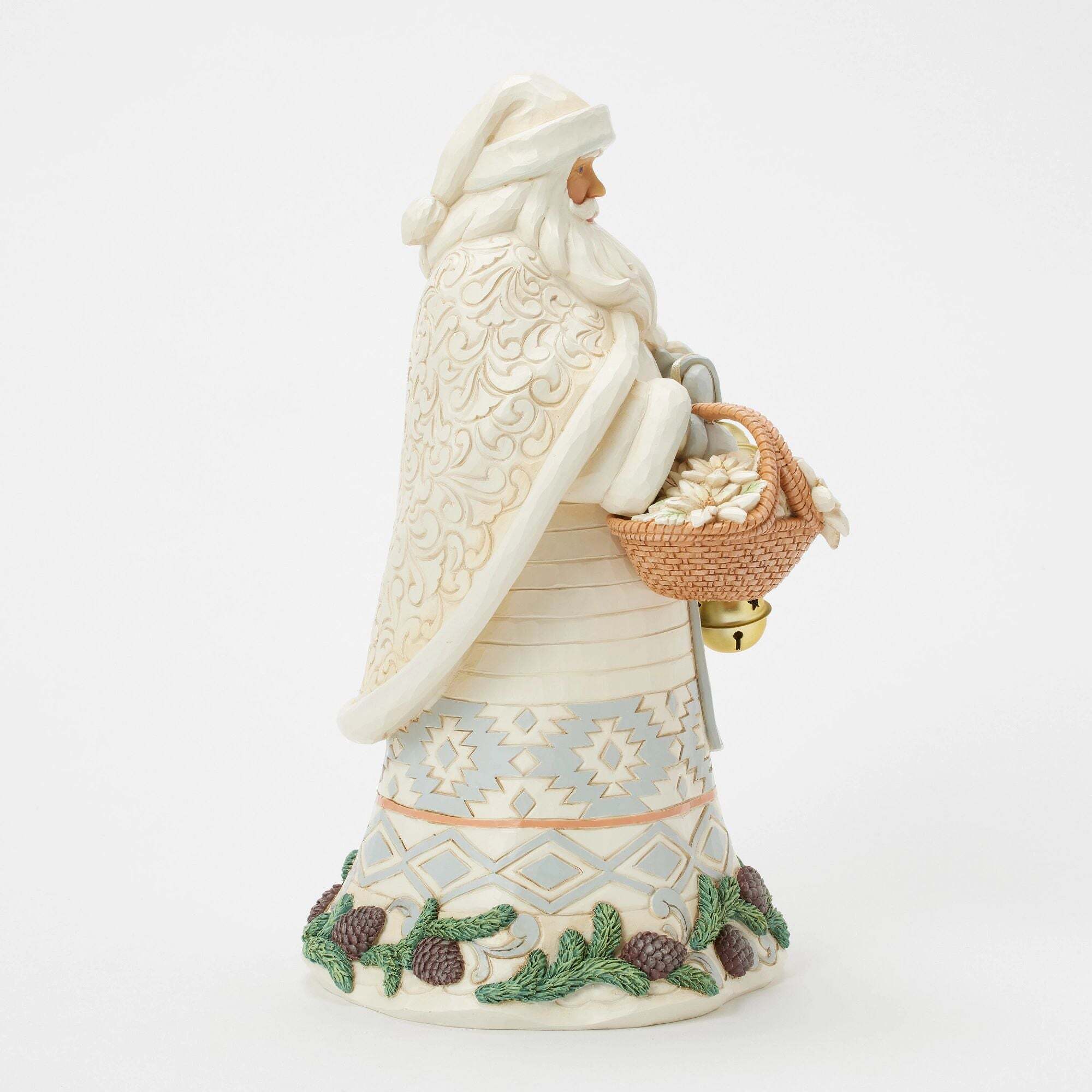 This captivating Christmas by Jim Shore is dressed in a cape with patterns inspired by Native American traditions, in subtle hues that evoke harmony with nature. He carries a basket of white poinsettias and a belt of bells.