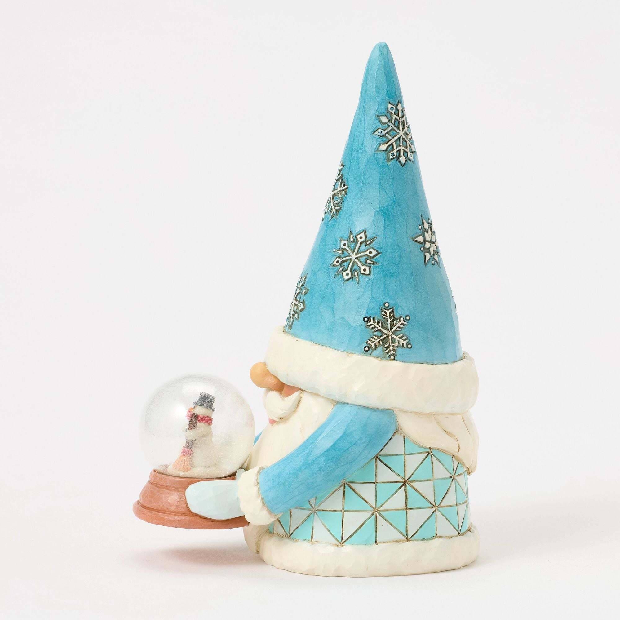 This Jim Shore Christmas gnome wears a hat adorned with snowflakes. He also carries a charming snow globe depicting a miniature snowman scene, capturing the magic of the season and adding a warm, magical touch to your holiday decor.