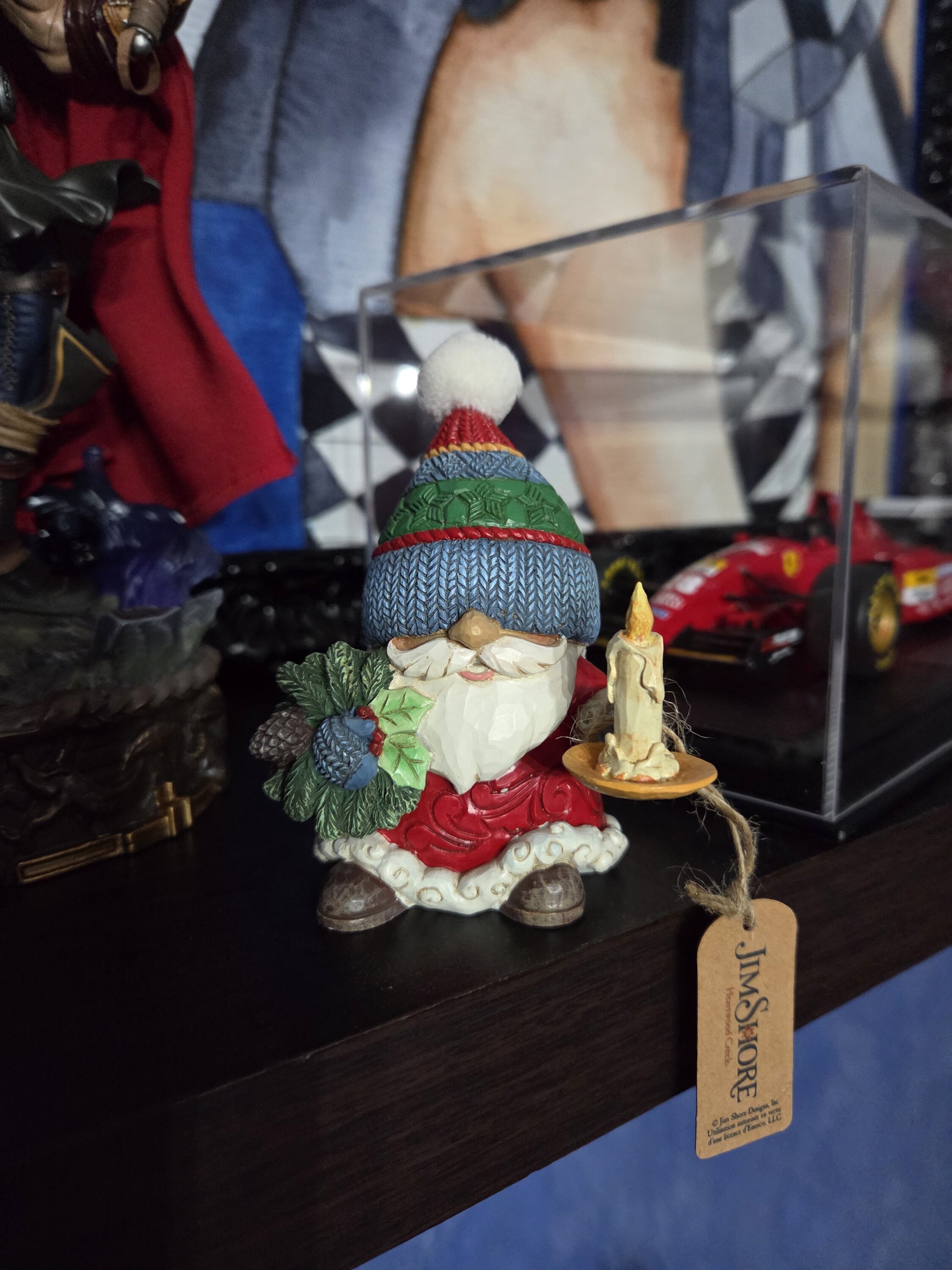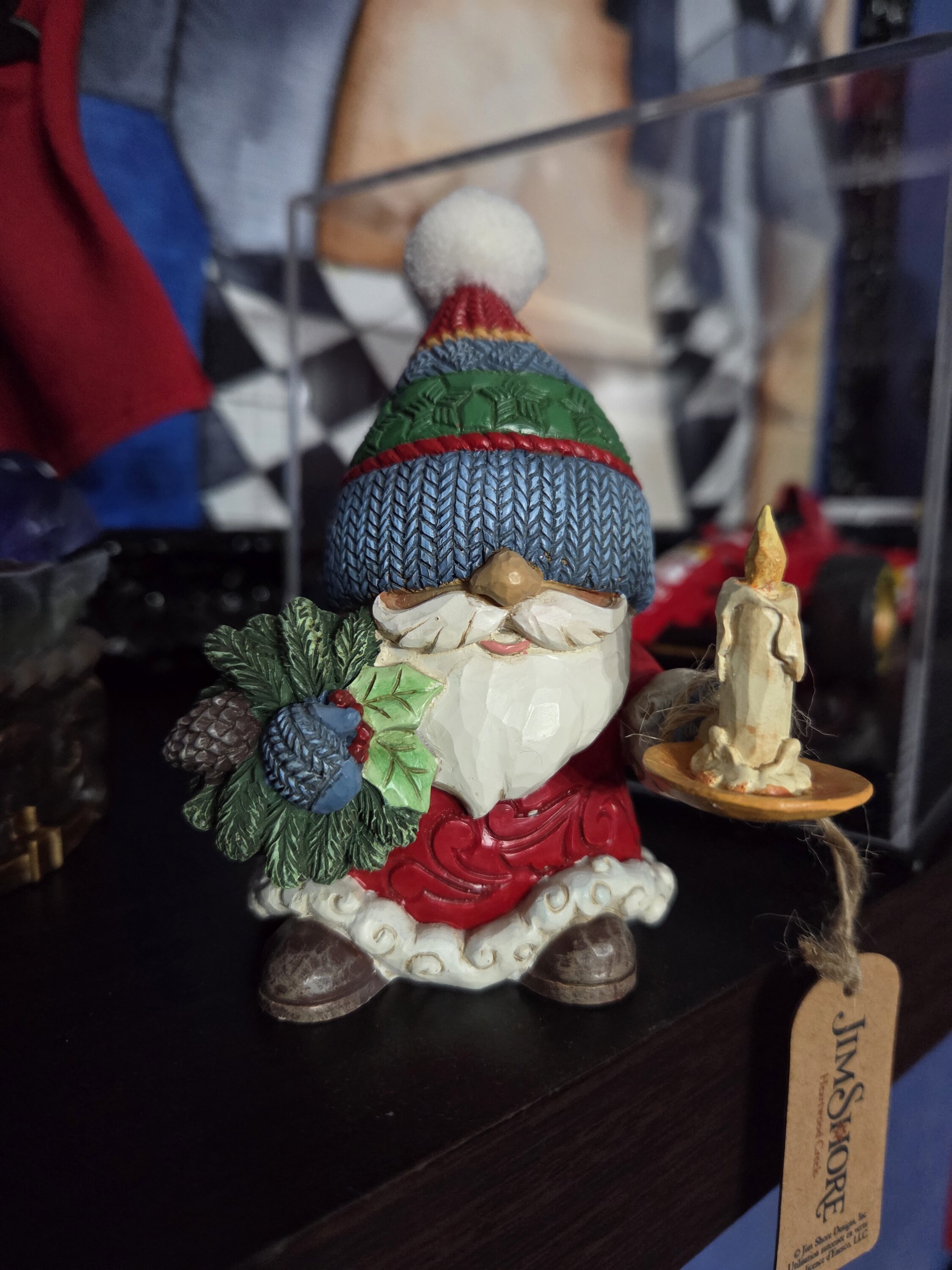 This festive Jim Shore gnome brings the warmth of the holidays with a lit candle in his hand, his hat over his eyes. Dressed in a floral-patterned coat and a textured hat, he holds a wreath in his hand, ready to decorate the place with joy.