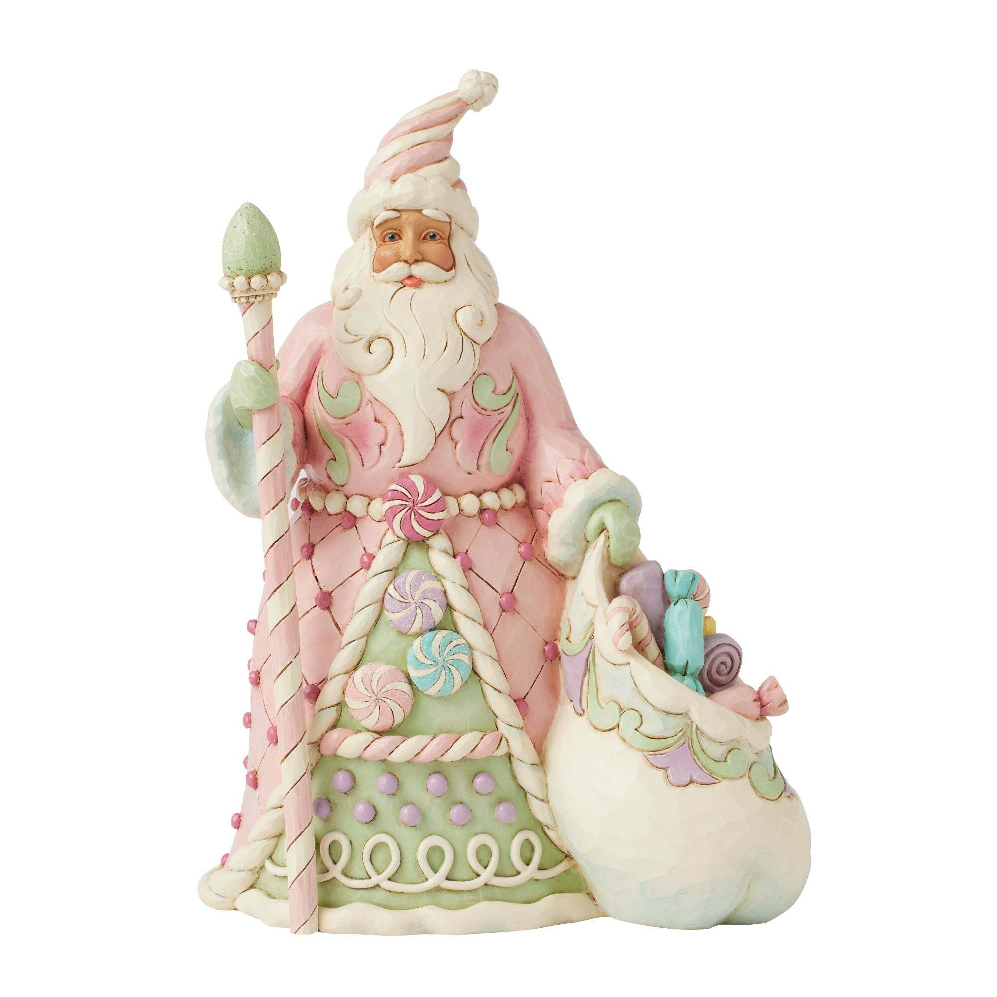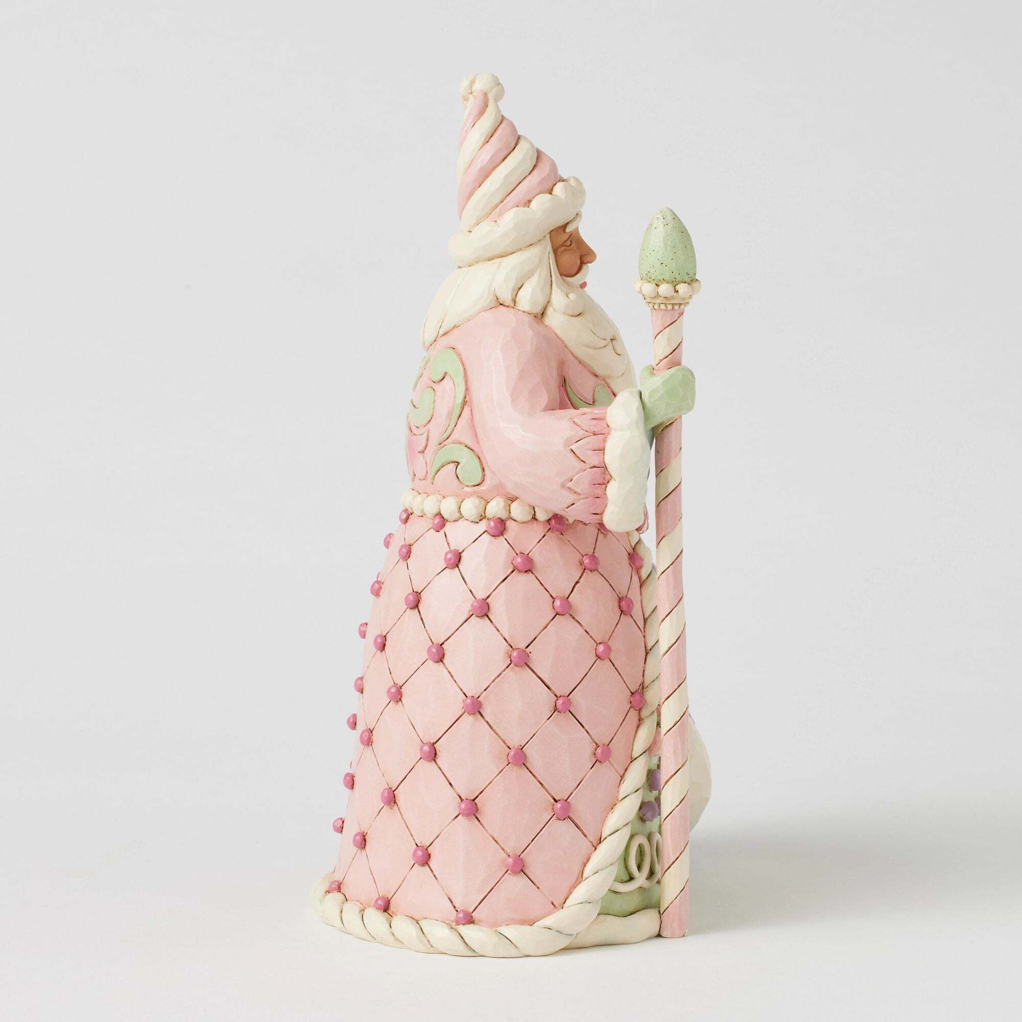 This charming Christmas figurine from the Heartwood Sweets collection, created by Jim Shore, features pretty pastel shades of pink and green, decorated with candy. Holding a candy cane and a bag of treats, his hat resembles a swirling ice cream, while his cape features the artist's designs.