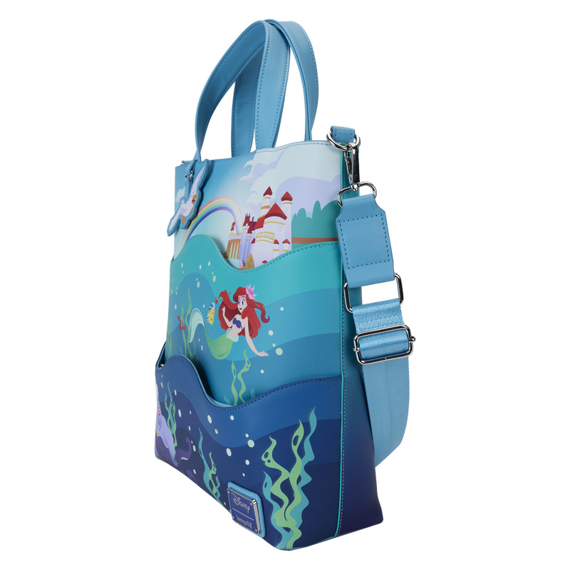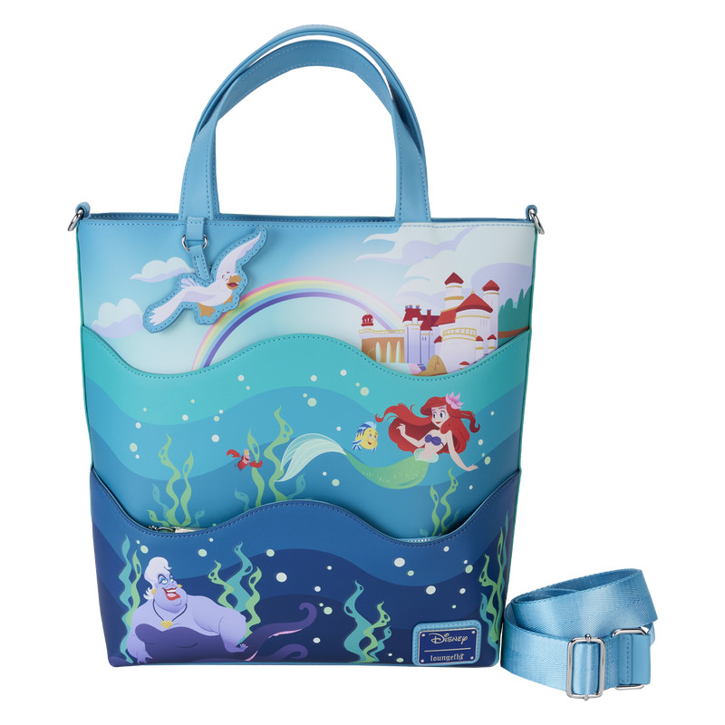 This tote bag features original art that comes to life in colorful print and applique form. At the bottom of the front of the bag, Disney’s Ursula beckons as bubbles all around her rise. Above her, a die-cut wave conceals a hidden zipper compartment for storing smaller items on your journeys. The sea grows lighter in color as the scene changes above her: Disney’s Ariel, Flounder, and Sebastian swim happily among the flowing aquatic plant life—and more bubbles. Above them is another scalloped die-cut wave, and behind it, there’s a compartment where you can slip slimmer items for your travels. Just above Ariel and her friends, a palace stands on shore—along with a full rainbow arc of colors. Disney’s Scuttle, as a vegan leather charm, tops off the look. On the back, Ariel makes an encore appearance, seated on a rock, her hair flowing under the sea. More bubbles and colorful plants surround her—and Flounder, delightful seahorses, and Sebastian are there, too. In the dark, elements of the bubbles, plants, and Ariel’s tail glow! The top zips closed to secure all your items, and inside, you’ll find various pockets and slots for organizing and storing your belongings. A sturdy handle and a detachable, adjustable strap add convenience. Make this tote bag a swimmingly fun part of your world.