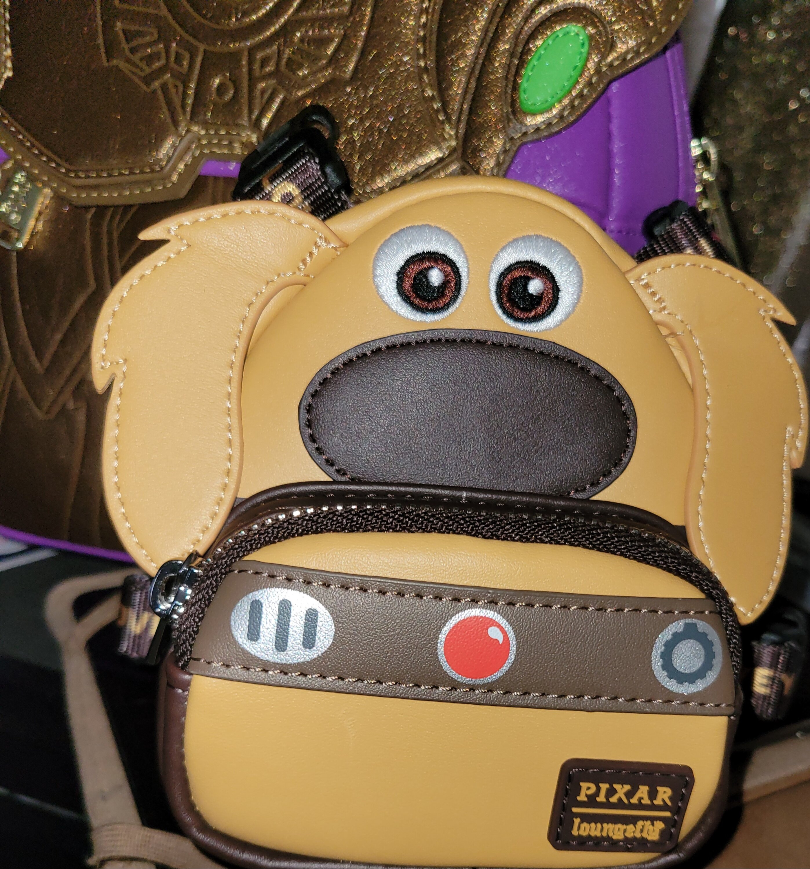 Loungefly Disney-Pixar Up 15th Anniversary Doug Cosplay Mini Backpack is made of durable material. vegan leather (polyurethane). The harness has adjustable nylon straps and shiny silver hardware. Additional features include applique and engraved details. Take note of the matching interior lining.