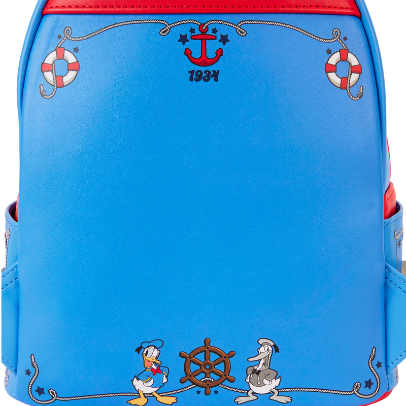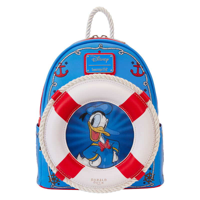 Oh, boy, oh boy—ahoy! Sail away with something fun! Disney’s Donald Duck is the star of this handy backpack. The front circular pocket features a life ring with real roping, and Donald Duck’s face appears in the middle. Lenticular details reveal him in black and white, but with a flick of the wrist, his face appears in color. Star, anchor, and nautical roping printed designs, on this blue backpack, add pops of color in red and darker blue. Original artwork continues on the sides and back of this accessory, which features the 1934 anniversary date. A real rope top handle adds convenience and finishes the look with extra character. Make waves while celebrating Donald Duck’s 90th anniversary in style.
