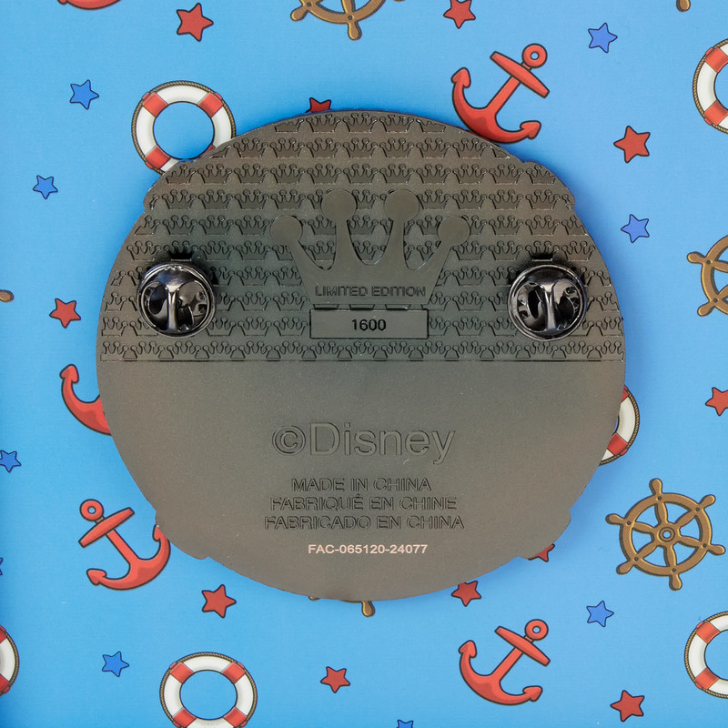 A shipshape pin collection is not complete without a little sparkle. This special collector box pin is ready to sail into your collection. On the front of this circular-shaped pin, Disney’s Donald Duck makes a starring appearance. He’s in the center of a life preserver, and you’ll find his name and date (1934) written below. Donald Duck appears in full color, but with the flick of a wrist (thanks to lenticular features), he also appears in black and white. Glitter decorates the edges of the life ring to add extra shine. Make waves while celebrating Donald Duck’s 90th anniversary.