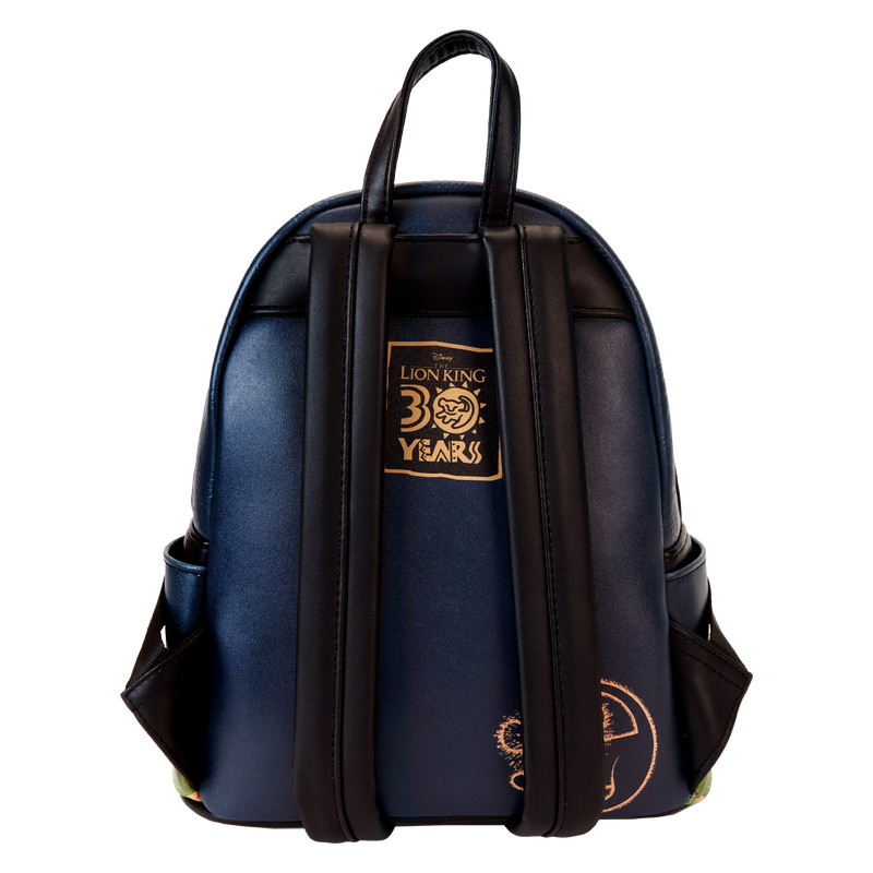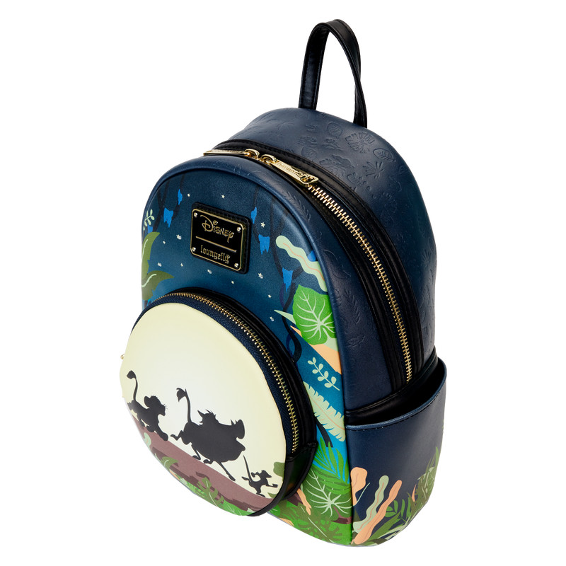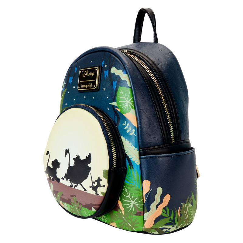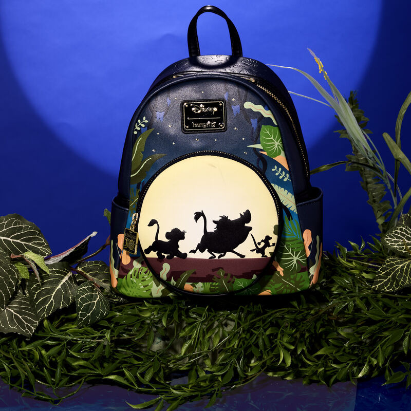 Kick back and let your worry-free lifestyle run wild! The Loungefly Lion King 30th Anniversary Hakuna Matata Silhouette Mini Backpack brings a chill new look to your everyday vibe. On the front, a full moon rises on the bag’s front zipper pocket as Timon, Pumbaa, and Simba walk across a log. Up above, a leafy backdrop frames a starry night sky. Turn down the lights to see the moon glow in the dark while the stars illuminate with LED light-up features! A 30th-anniversary enamel zipper charm accompanies the zipper pocket, and debossed leaf prints join lush vegetation on the bag’s sides. On the back, Simba’s portrait appears with the anniversary logo. Whether you’re taking things easy or exploring the savannah, this mini backpack will keep you looking cool and relaxed.