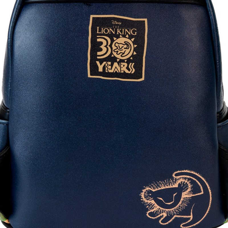 The Loungefly Lion King 30th Anniversary Hakuna Matata Silhouette Mini Backpack is made of vegan leather (polyurethane). Bag has adjustable shoulder straps and shiny gold hardware. Additional features include debossed, glow-in-the-dark, LED light, and printed details. Take note of the coordinating inside lining.