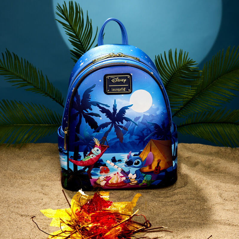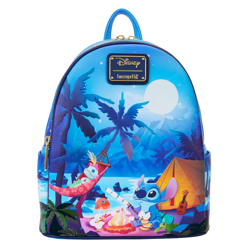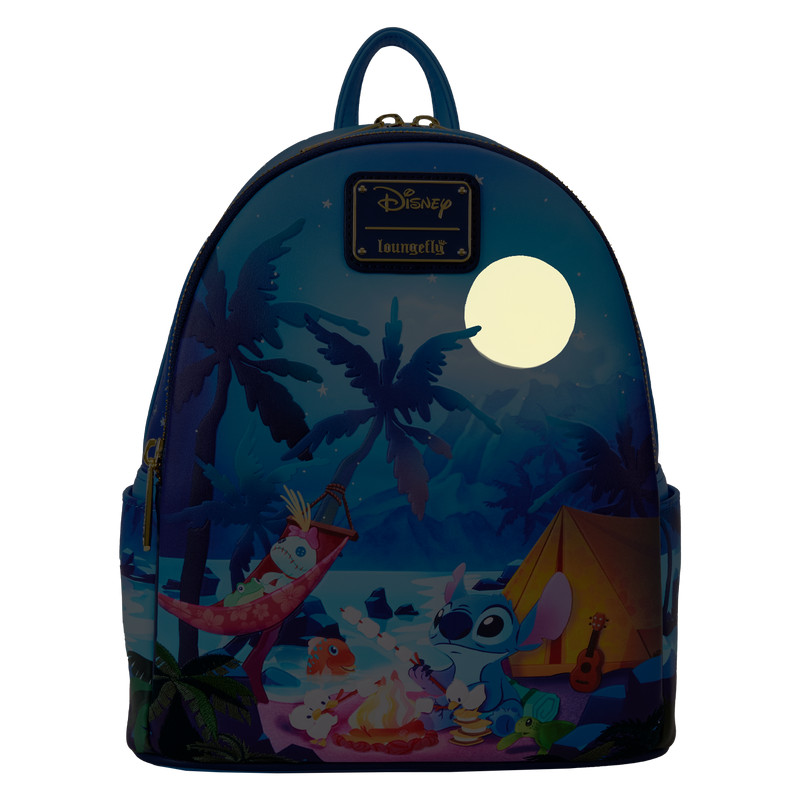 There’s nothing like sharing s’mores under the stars! Camp out on the tropical shores of the great outdoors with the Loungefly Disney Lilo & Stitch Camping Cuties Mini Backpack. On the front zipper pocket, Stitch roasts marshmallows at his campsite. Look closely and you’ll find Scrump, Pudge, a frog, ducklings, and a turtle joining in the fun. Up above, a full moon rises above the palm trees. Turn down the lights to see the moon and stars glow in the dark! The beach scene continues onto the bag’s side pockets, where turtles and ducklings walk along the sand. On the back, a frog sits near a lantern beneath star-covered shoulder straps. This mini backpack has plenty of room to store your gear and is the perfect accessory for hanging out with friends.