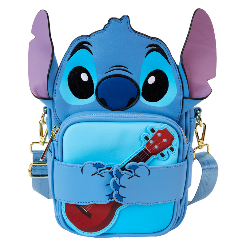 The Loungefly Stitch Camping Cuties CROSSBUDDIES Bag is made of vegan leather. Bag has adjustable (detachable) shoulder strap, detachable and reversable coin bag, and shiny gold hardware. Additional features include applique, embroidered, and printed details. Take note of the coordinating inside lining.