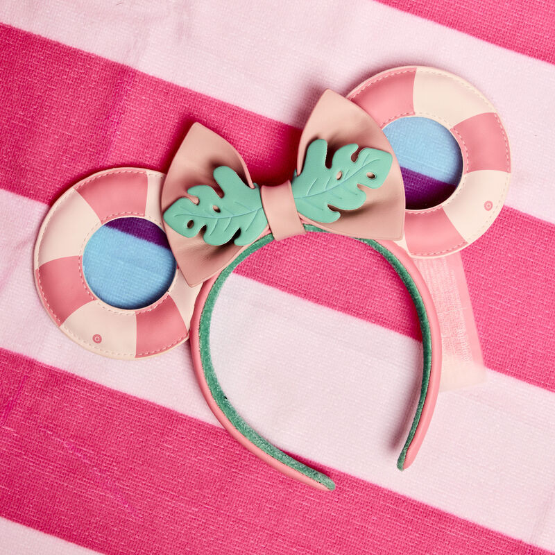 Dreaming of the perfect vacay? Check-in for your next getaway with the Loungefly Minnie Mouse Vacation Style Ear Headband. Bask in the sunshine with die-cut ears in the shape of pool floaties – you’ll even see daylight reflect off the water in the center of each ear! A tropical leaf cinches the headband’s pastel pink bow, which can be removed to accommodate personal style preferences. This accessory adds an air of relaxation to any outing and will keep you looking stylish throughout your stay.