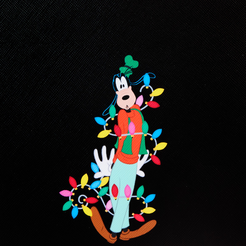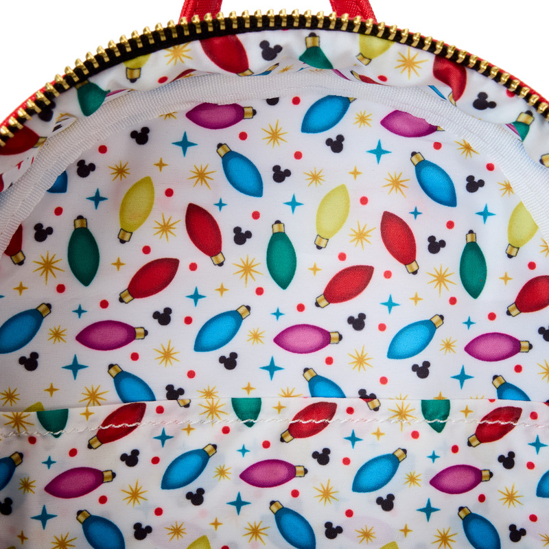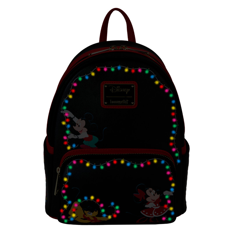 Hip-hip-hooray! Festive lights coming your way! Keep all the holiday lights close wherever you go with our Disneyβs Mickey Mouse and Friends light-up mini backpack. An elegant black background makes the festive lights outlining the border on the front pop. Mickey Mouse is at the top, hanging a string of lights, while Disneyβs Minnie Mouse and Pluto join in on the pocket below. In the dark, all the lights around the trim on the front light up in different colors! Turn the backpack around, and youβll find festive prints of lights and Disneyβs Chip & Dale, Goofy, Daisy Duck, and Donald Duck. Spread the cheer and warmth of the season in style with this brilliant accessory.