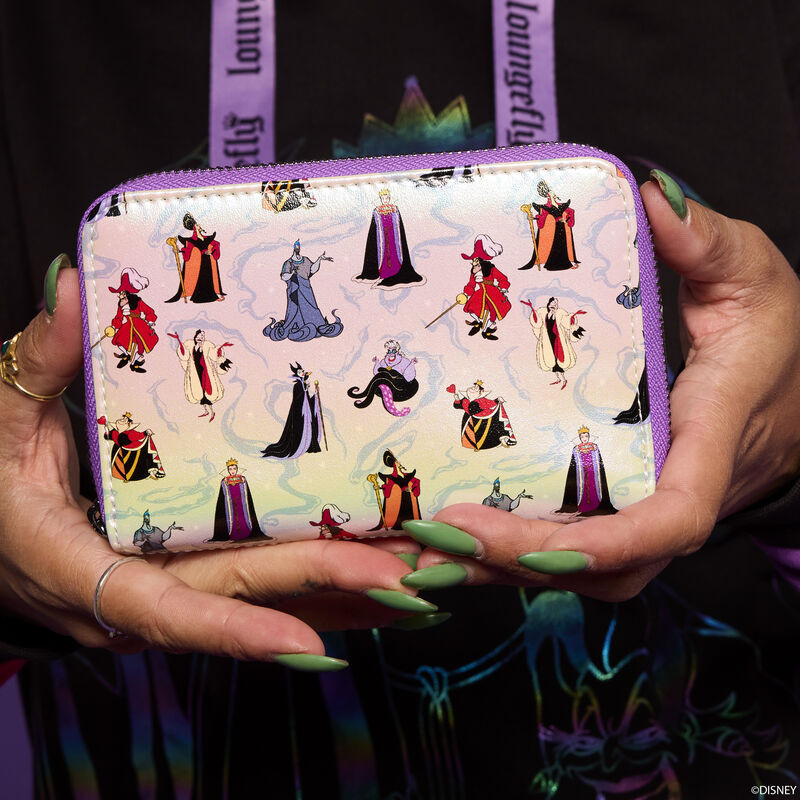 Gleam while you scheme. Wreak fashionable havoc with our Disney Villains iridescent zip-around wallet. The iridescent material covering this accessory carries a motif featuring some of Disney’s most famous villains, including the Queen of Hearts, Cruella de Vil, Maleficent, the Evil Queen, Hades, Jafar, Captain Hook, and Ursula. Secure your valuables and take off on all the fun adventures your dark heart desires.