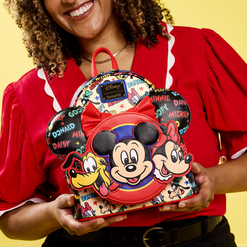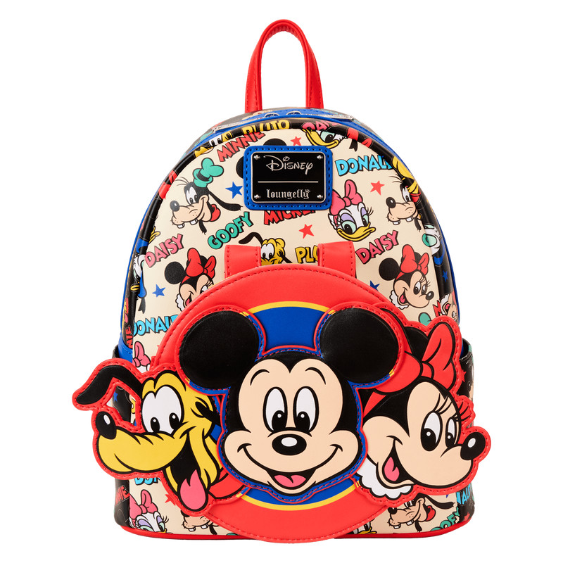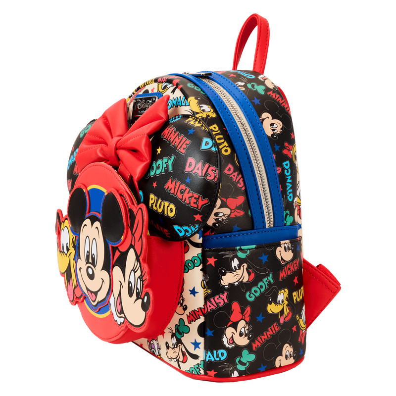 On with the show, dressed up with a bow! A timeless, classic look gets an extra splash of colors and fun with our Disney Mickey Mouse and Friends ear-holder backpack. The circular front drop-pocket features an applique of Disney’s Mickey Mouse, Minnie Mouse, and Pluto in classic and colorful style. Behind them, there’s a space to store a special mouse ears headband. The 3D applique bow in the middle of the headband has a snap in the back, so you can remove it, and the applique ears have a “puffed” look to them for an extra pop of detail. You’ll also find a motif print of Disney’s Mickey Mouse, Minnie Mouse, Donald Duck, Daisy Duck, Pluto, and Goofy—and their names are printed in colorful bursts of blue, green, yellow, and red. Pack your daily essentials and set off on celebratory adventures in style.