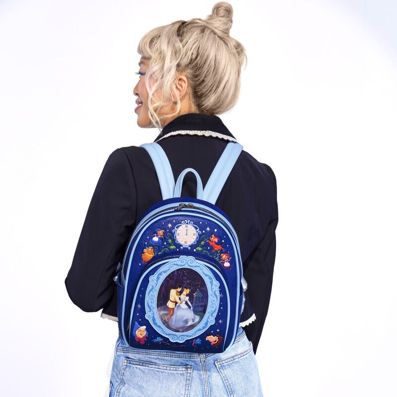 Step into your glass slippers and have a ball! This Disney’s Cinderella mini backpack is ready to make a star-studded entrance for a 75th-anniversary celebration. The front pocket features an applique cameo-shaped window, and inside, lenticular details reveal two different scenes: Cinderella dancing with Disney’s Prince Charming and Cinderella, in front of the castle, all dressed up in blue. At the top, an embroidered clock strikes 12, and fan-favorite characters come to life in print and embroidered detail. Pack just what you need for the day—or an evening outing—of magical adventures.