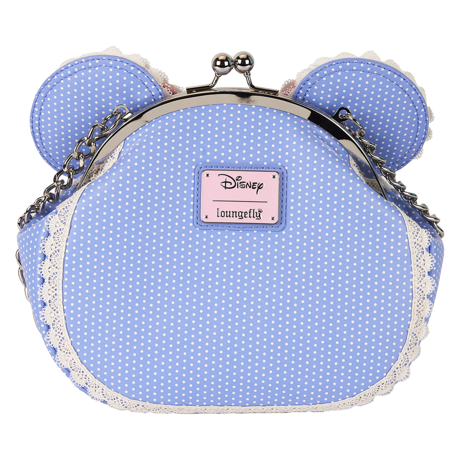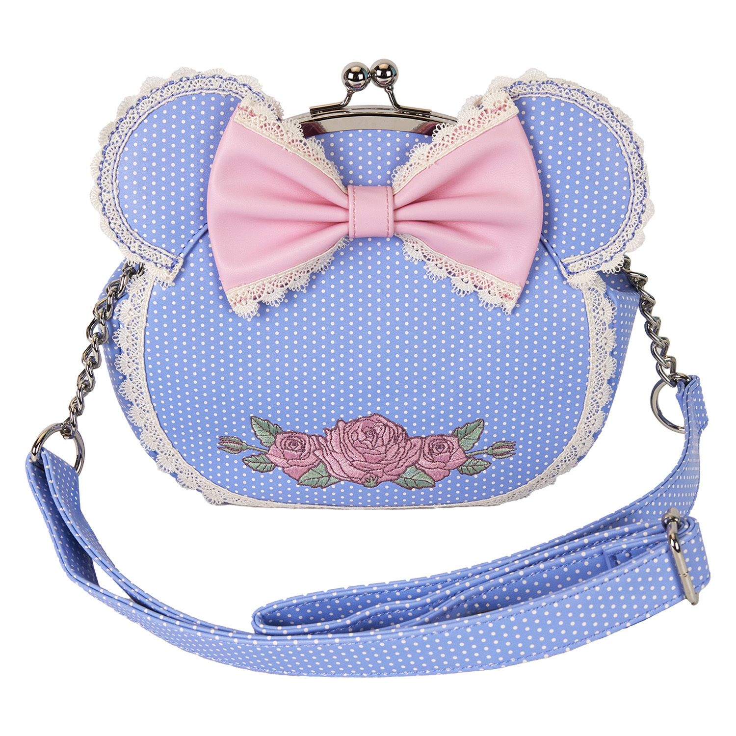 Fashion is in full bloom with this Disneyβs Minnie Mouse βkiss-lockβ crossbody bag. Special Minnie Mouse flourishesβand an interlocking prong claspβmake this accessory charmingly old fashioned. Her applique ears, decorated with a polka dot print, pop up over the top, and lace trim adds a delicate touch. Thereβs a pink 3D bow in the middle, and embroidered roses unfurl in decorative detail. Pack your daily essentials, take off on an adventure, and watch the fun blossom.