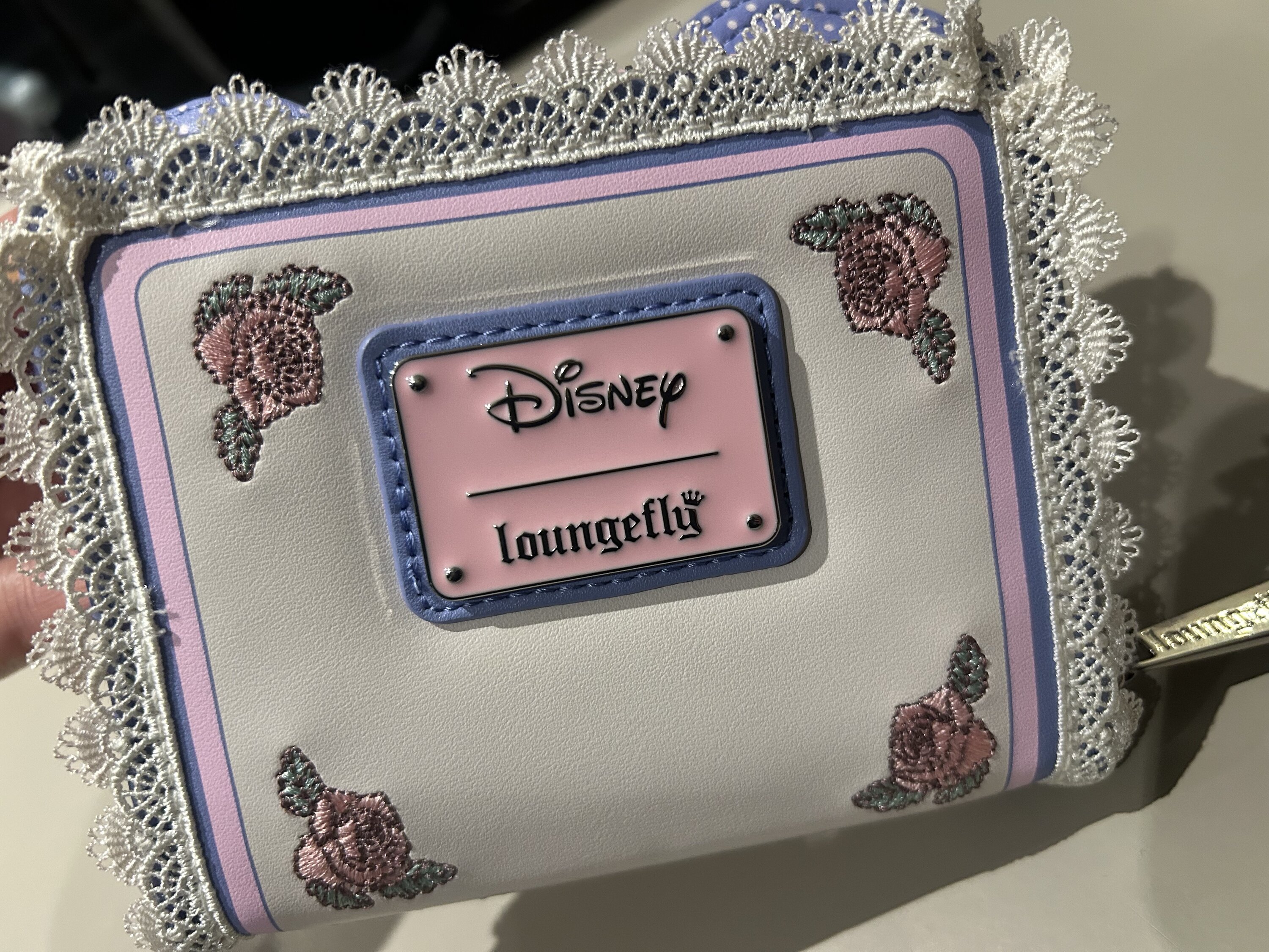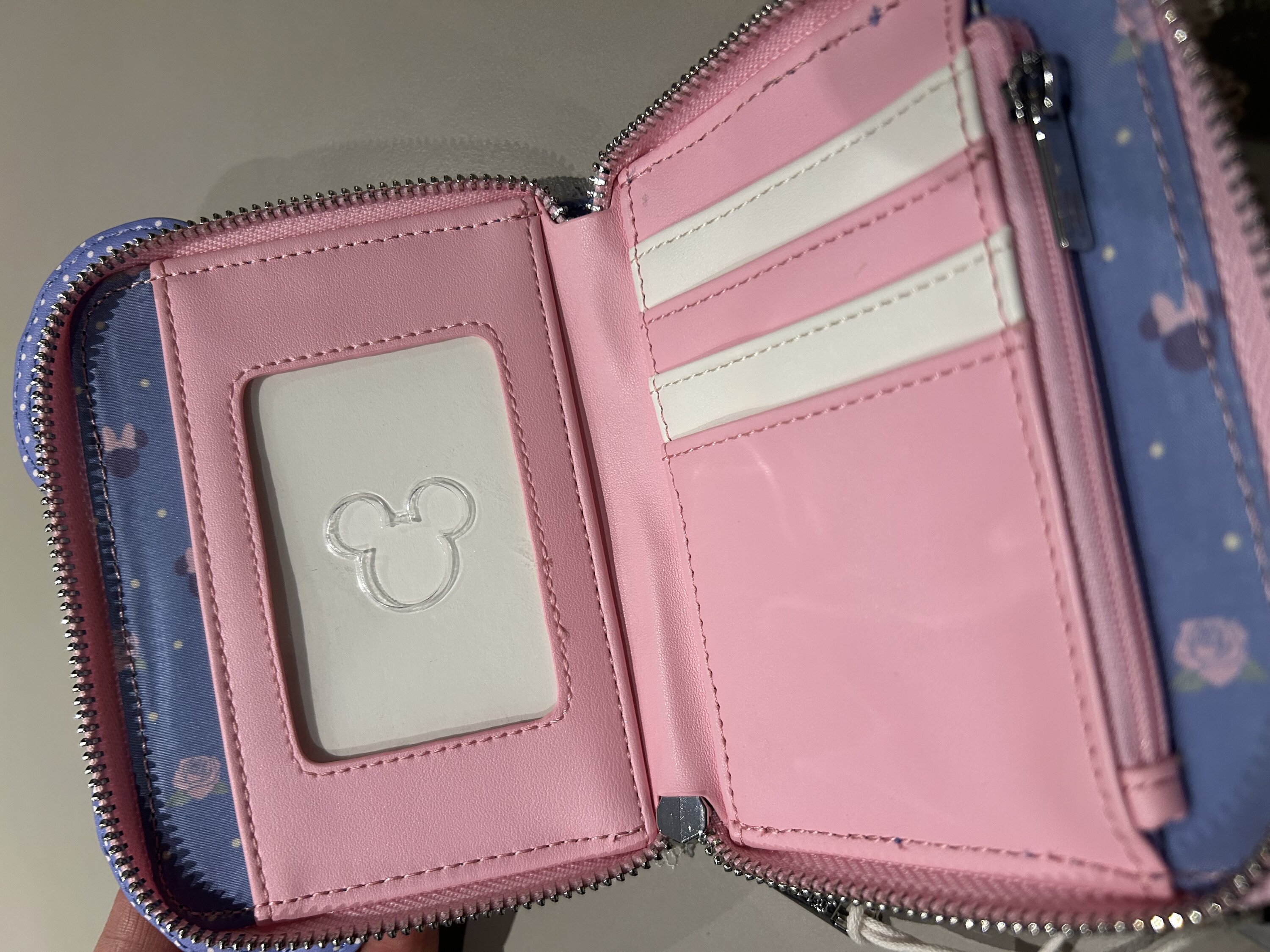 Features : silver-colored metal hardware, approximately four slots for holding cards, zipper compartment, one clear slot for displaying your ID, with a die-cut shape of Disney’s Mickey Mouse ears, applique, printed, 3D bow, lace, and embroidered details, coordinating inside lining