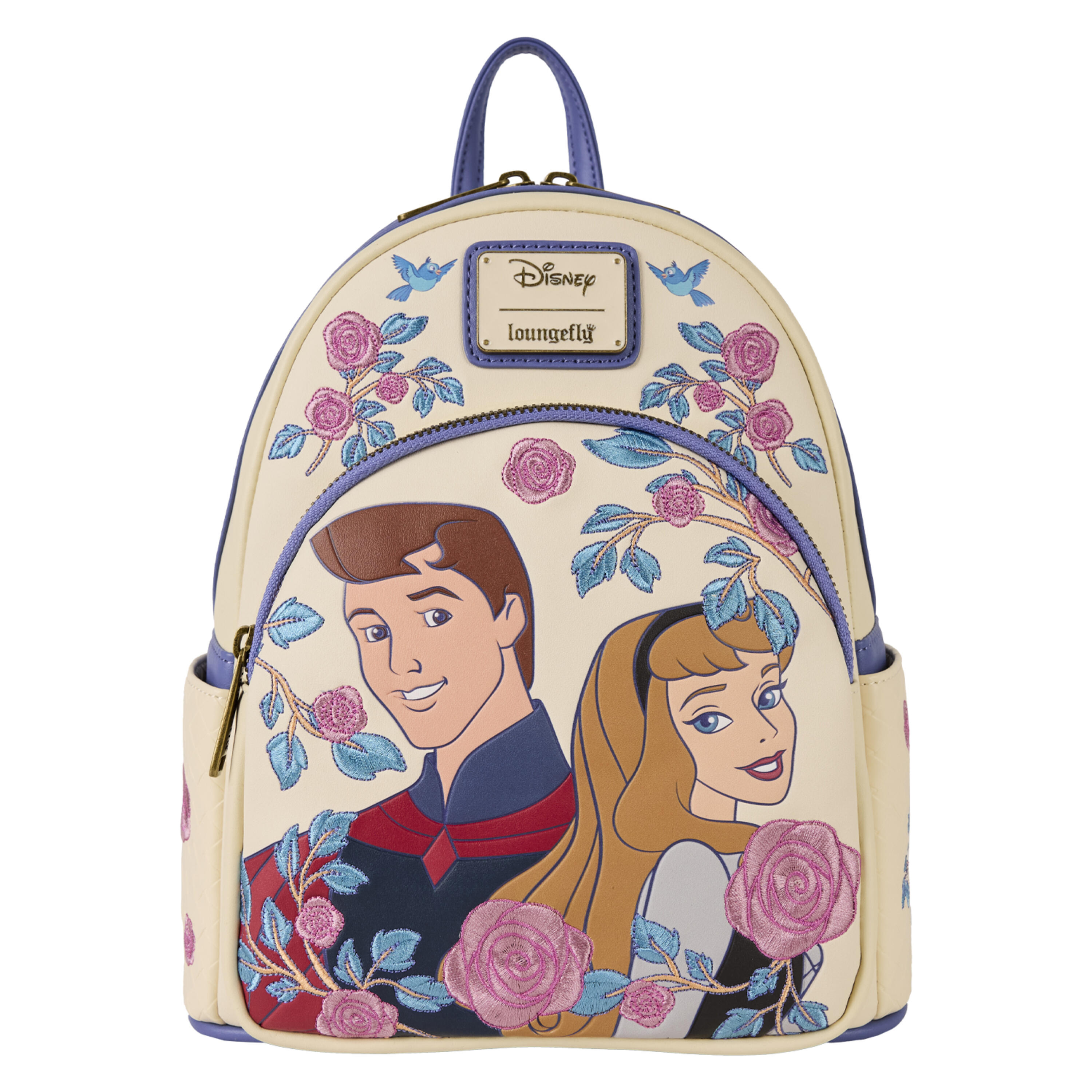 Gorgeous pink roses are embroidered around an image of Prince Phillip and Princess Aurora from Disney's Sleeping Beauty. More floral details appear on the side pockets over a woven faux leather background for a more dynamic design.