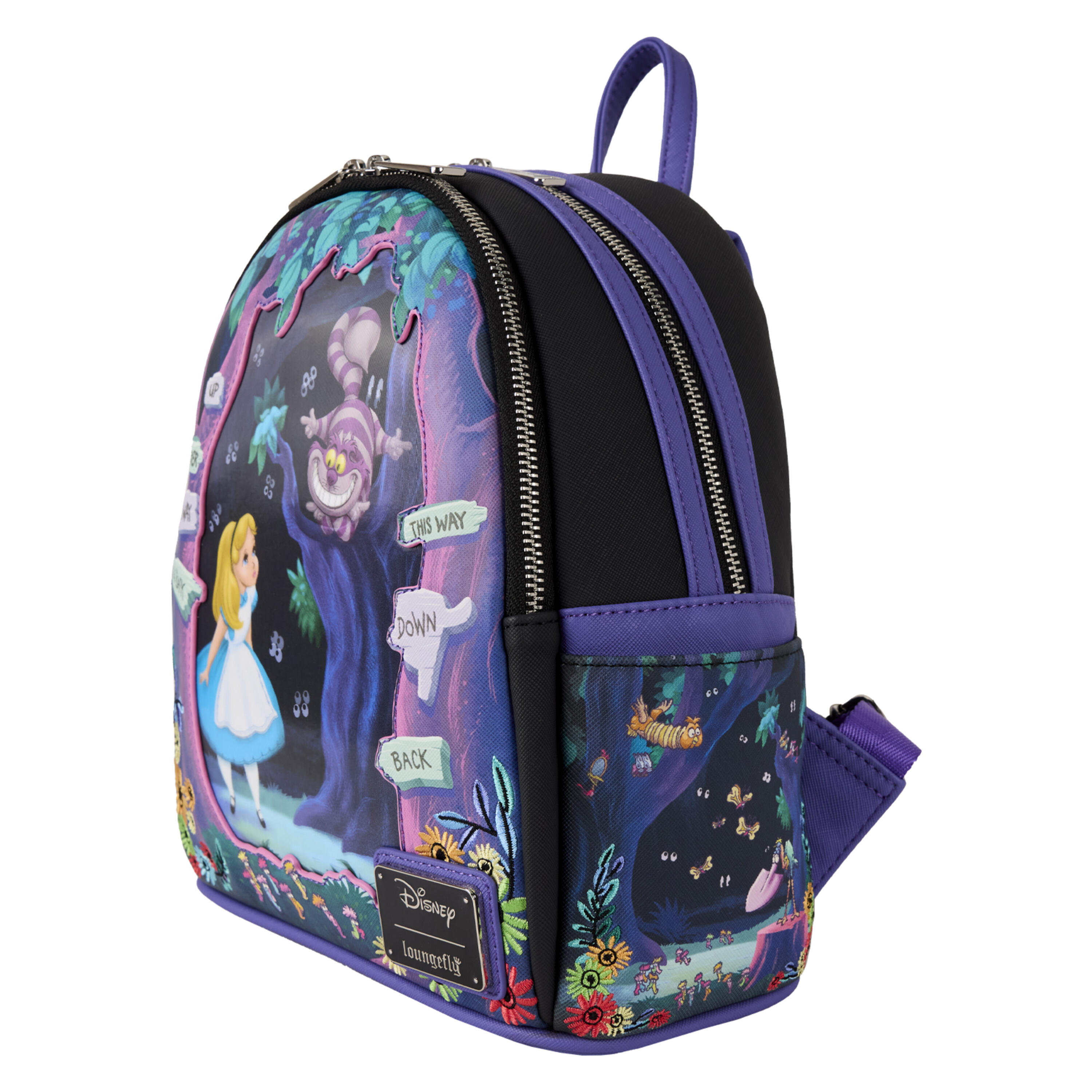Shift the bag back and forth and the Cheshire Cat appears and disappears in a lenticular feature. Visuals of Wonderland appear around Alice on the front and across the side pockets.