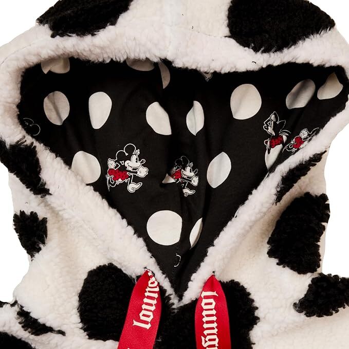 Stay cozy and stylish with the Loungefly Disney Minnie Rocks the Dots Sherpa Hoodie. Featuring Minnie Mouse's iconic bow strings and a black and white polka dot design, this hoodie combines fashion and comfort. Perfect for any Disney fan, this hoodie is a must-have for chilly days.