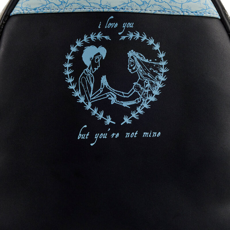 The Loungefly Corpse Bride Emily Bouquet Mini Backpack is made of vegan leather (polyurethane). Bag has adjustable shoulder straps and sturdy metal hardware. Additional features include faux flowers, applique, debossed, and printed details. Take note of the coordinating inside lining.