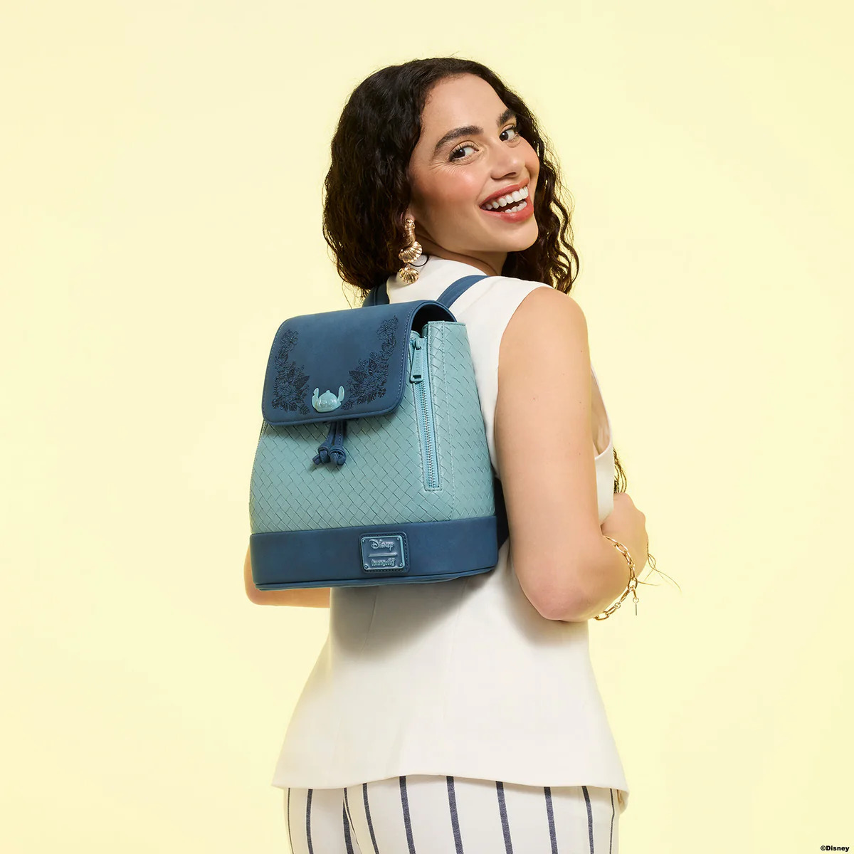 This mini backpack features a molded metal charm of Stitch on the top flap with embroidered floral details around him. With plenty of space to store whatever you need, this bag is ready for whatever your day holds!