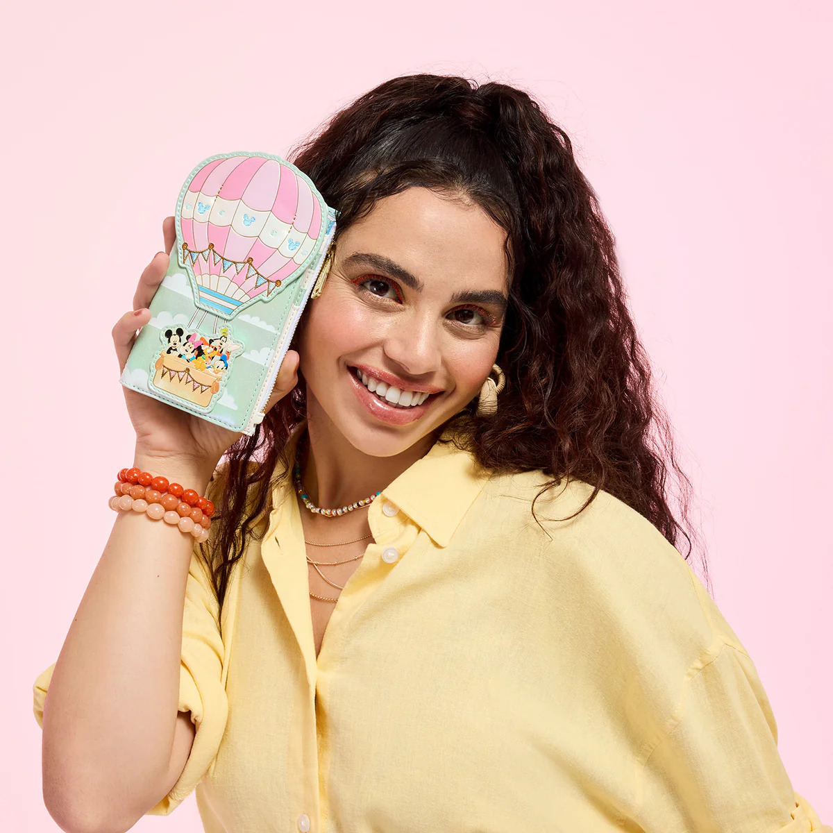 Make your style soar with this wallet! You'll find an applique of a hot air balloon on the front with some of your fav Disney characters along for the ride! On the back, you'll find more hot air balloons floating in the sky. Take a look inside and you'll find seven card slots and one clear slot for an ID.
