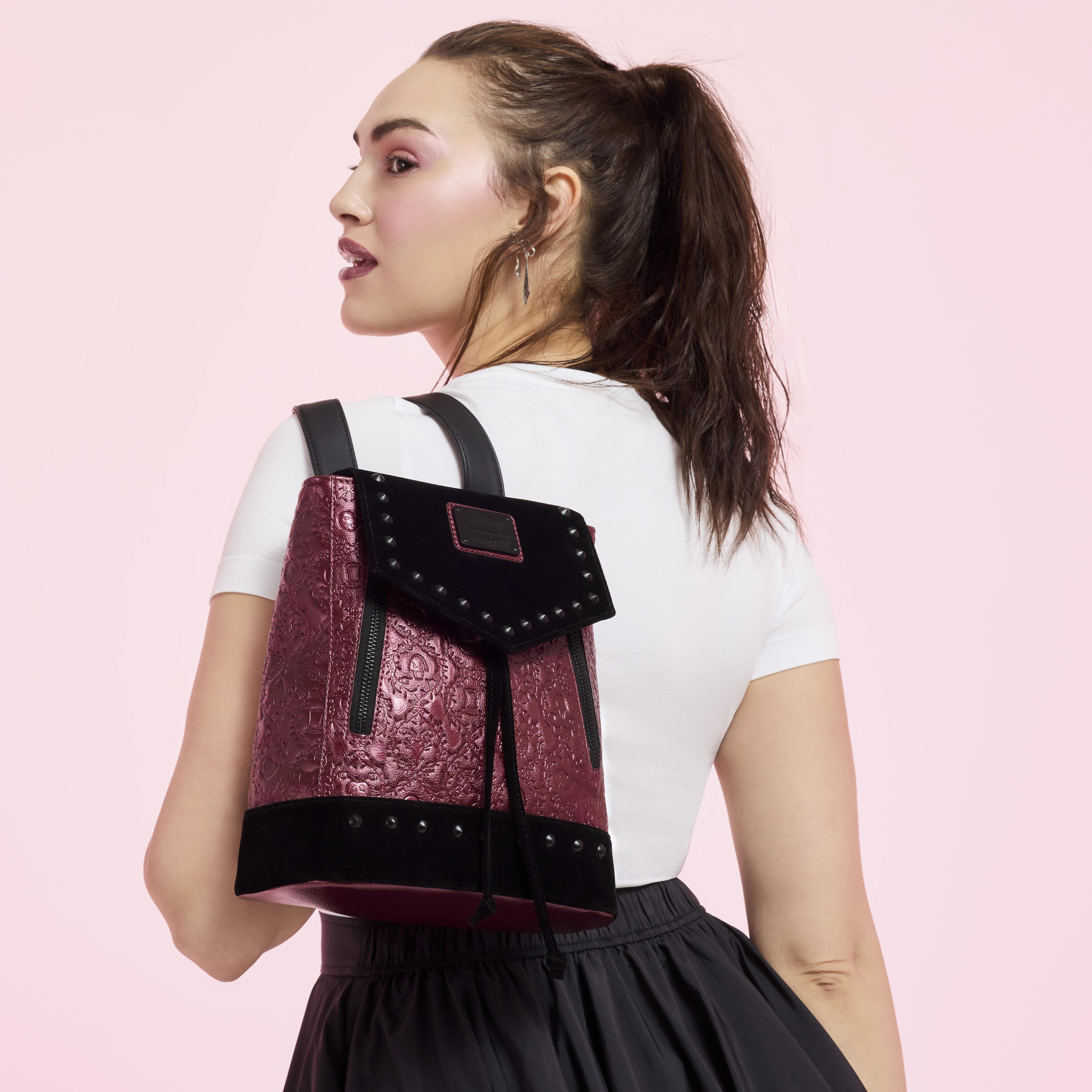 This mini backpack is the perfect accessory to add some edge to your look! Metallic faux leather, velvet, and studs make it stand out. All over, you'll find debossed symbols of some of your favorite Disney Villains surrounded by spiky vines!