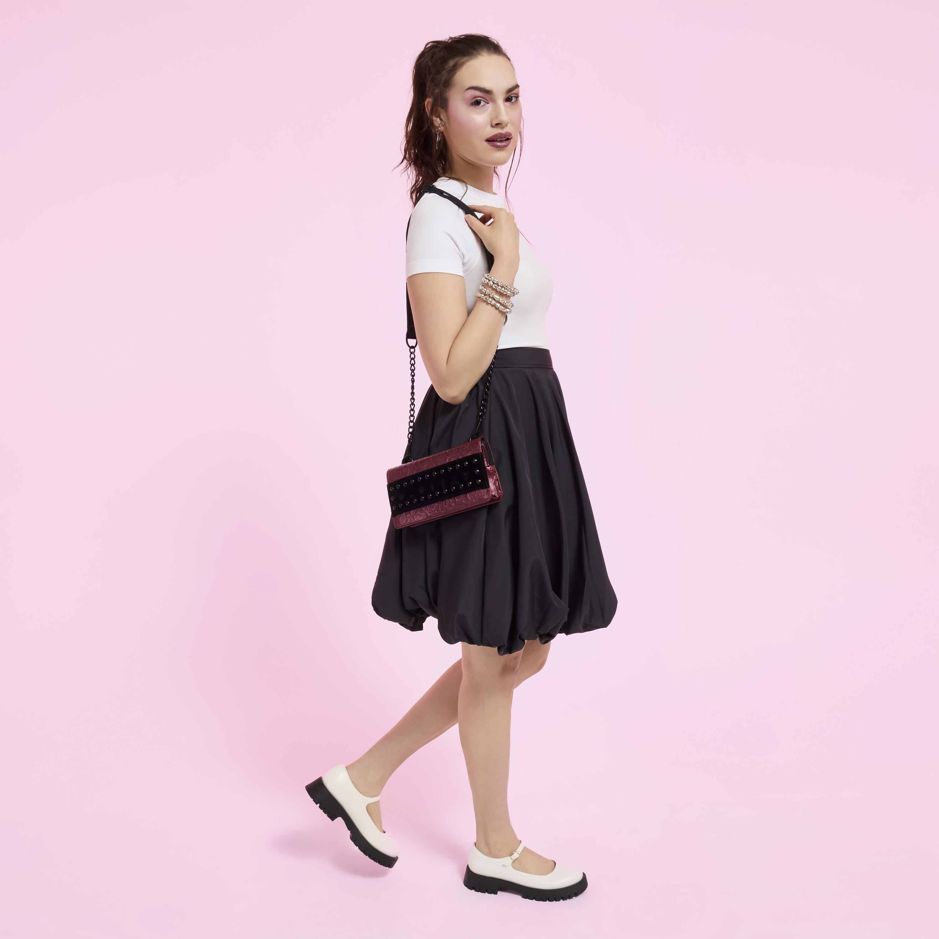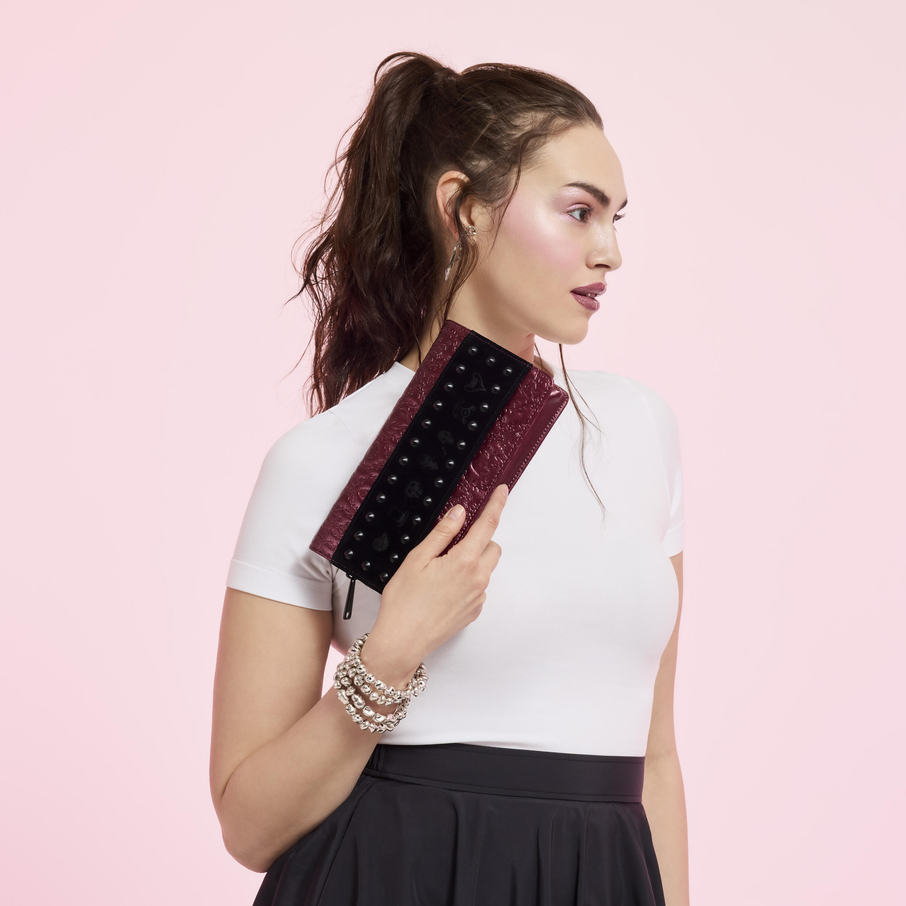 Find debossed symbols of popular Disney Villains within spiky thorns all over the bag. Stud cones and velvet bring the whole look together. This style is versatile: you can carry it as a clutch by using the wristlet strap or attach the crossbody strap to wear it like a purse!