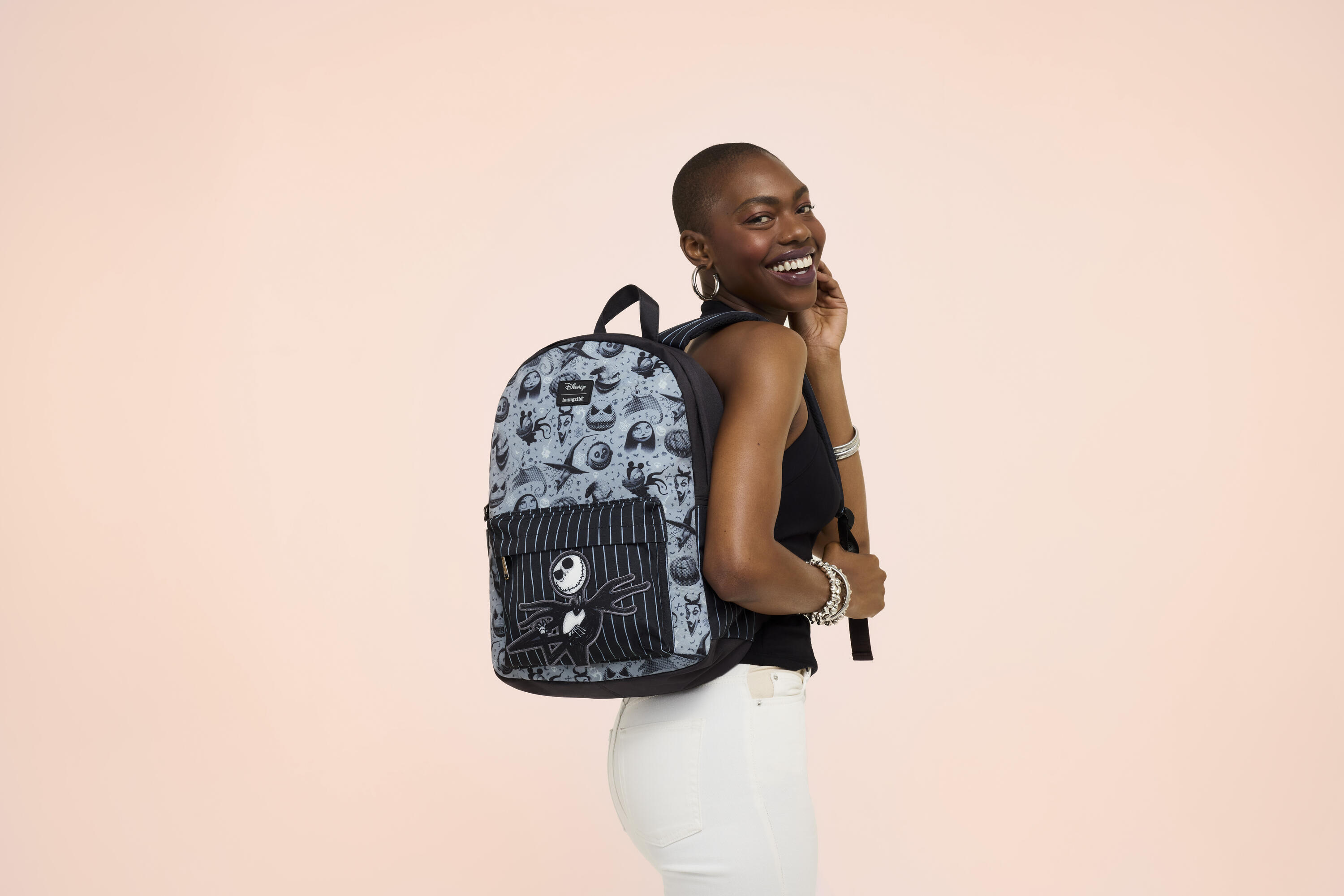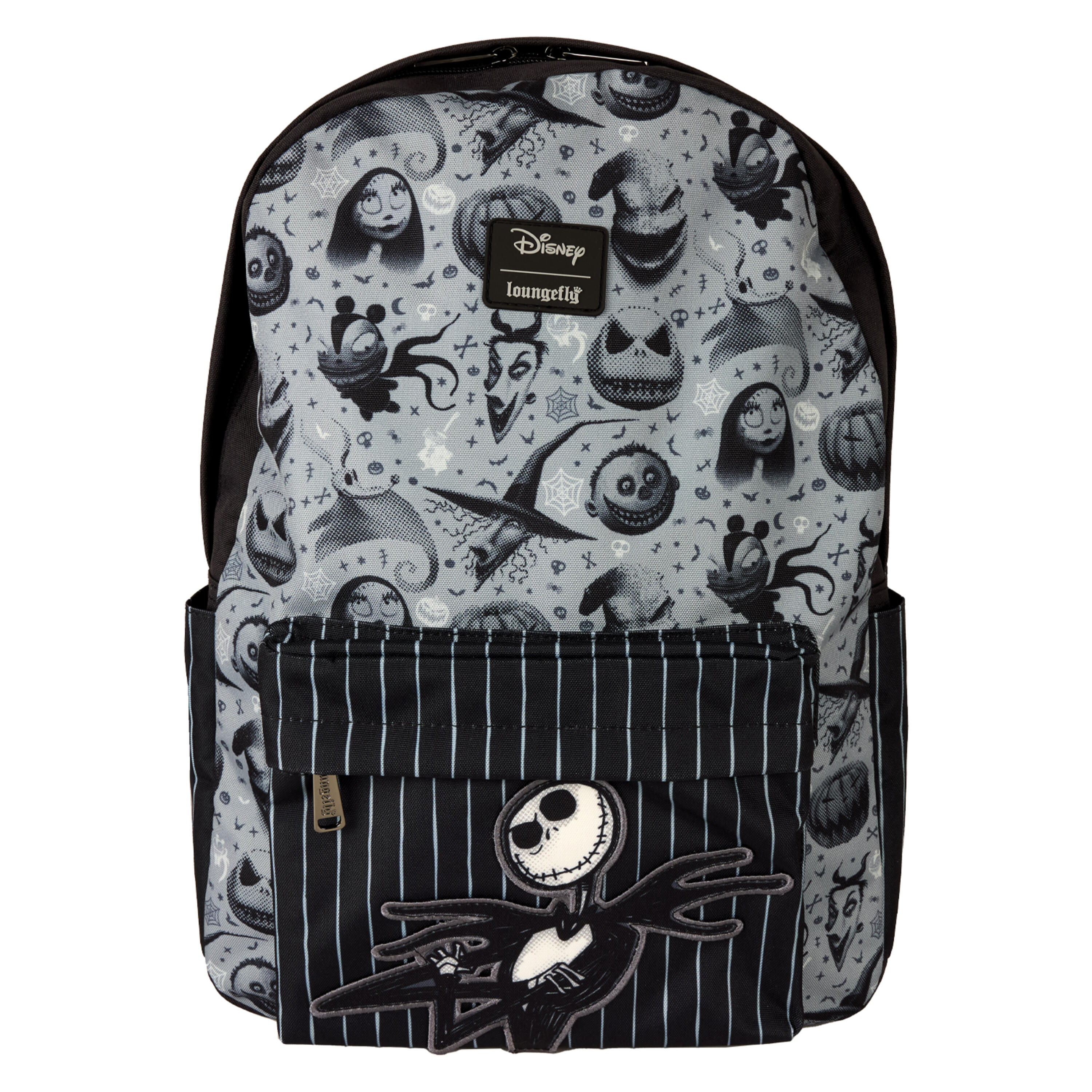 This full-size backpack pays tribute to everyone's favorite Pumpkin King! You'll find Jack Skellington on the front pocket against a black-and-white striped background. All over the front of the bag, you'll find images of some of your favorite characters from Halloween Town, including Jack, Sally, Oogie Boogie, and more!