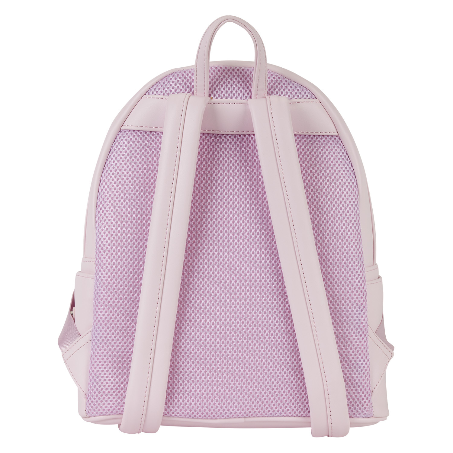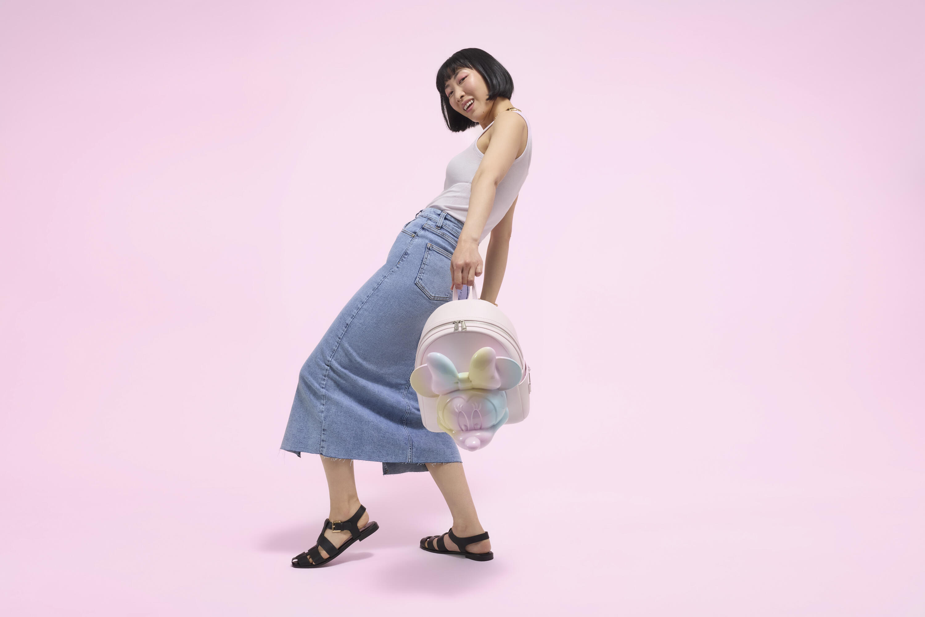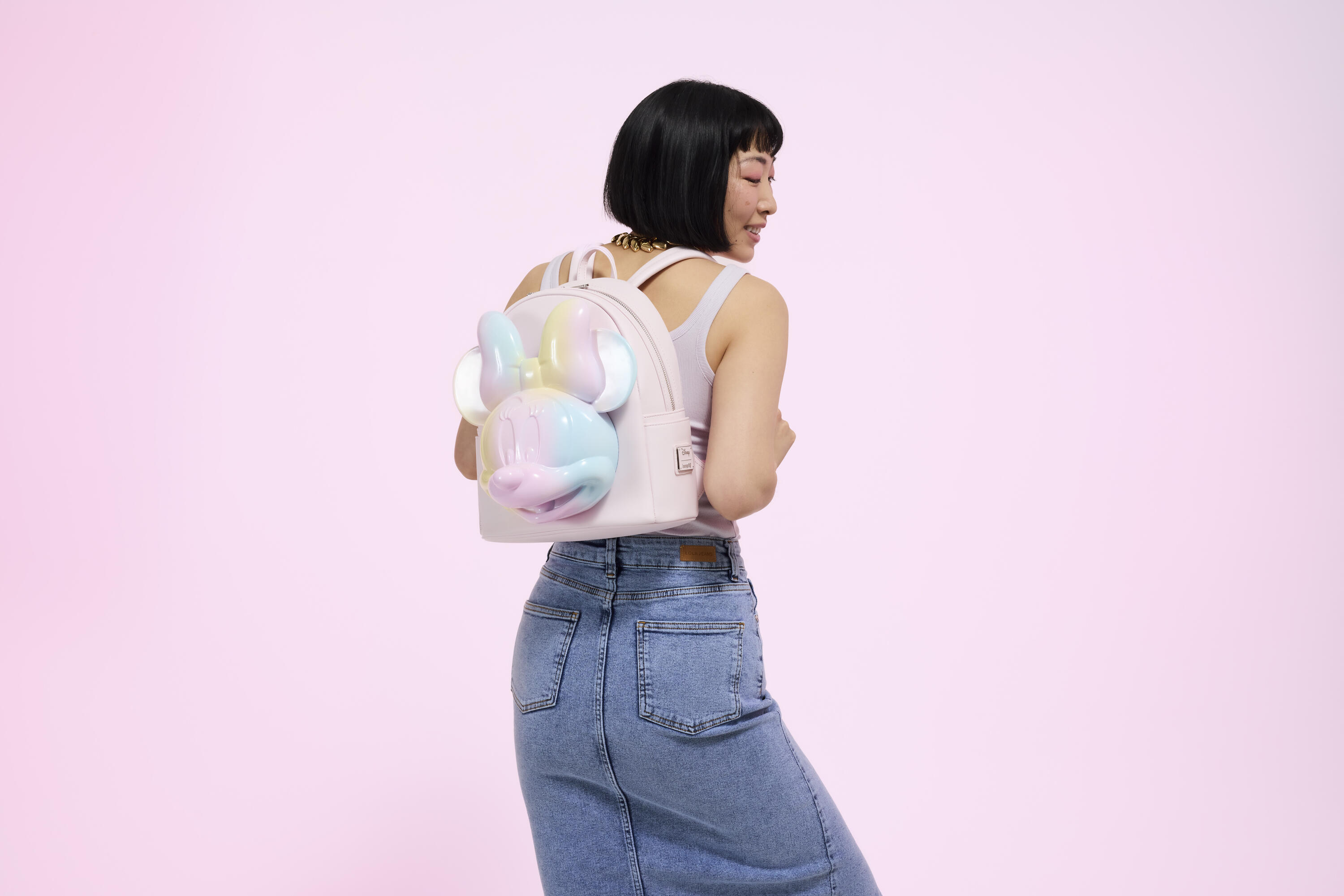 This backpack features a 3D-molded Minnie Mouse head! She grins out from the front of the bag. Minnie is decorated with pastel tie-dye of pink, blue, and yellow.