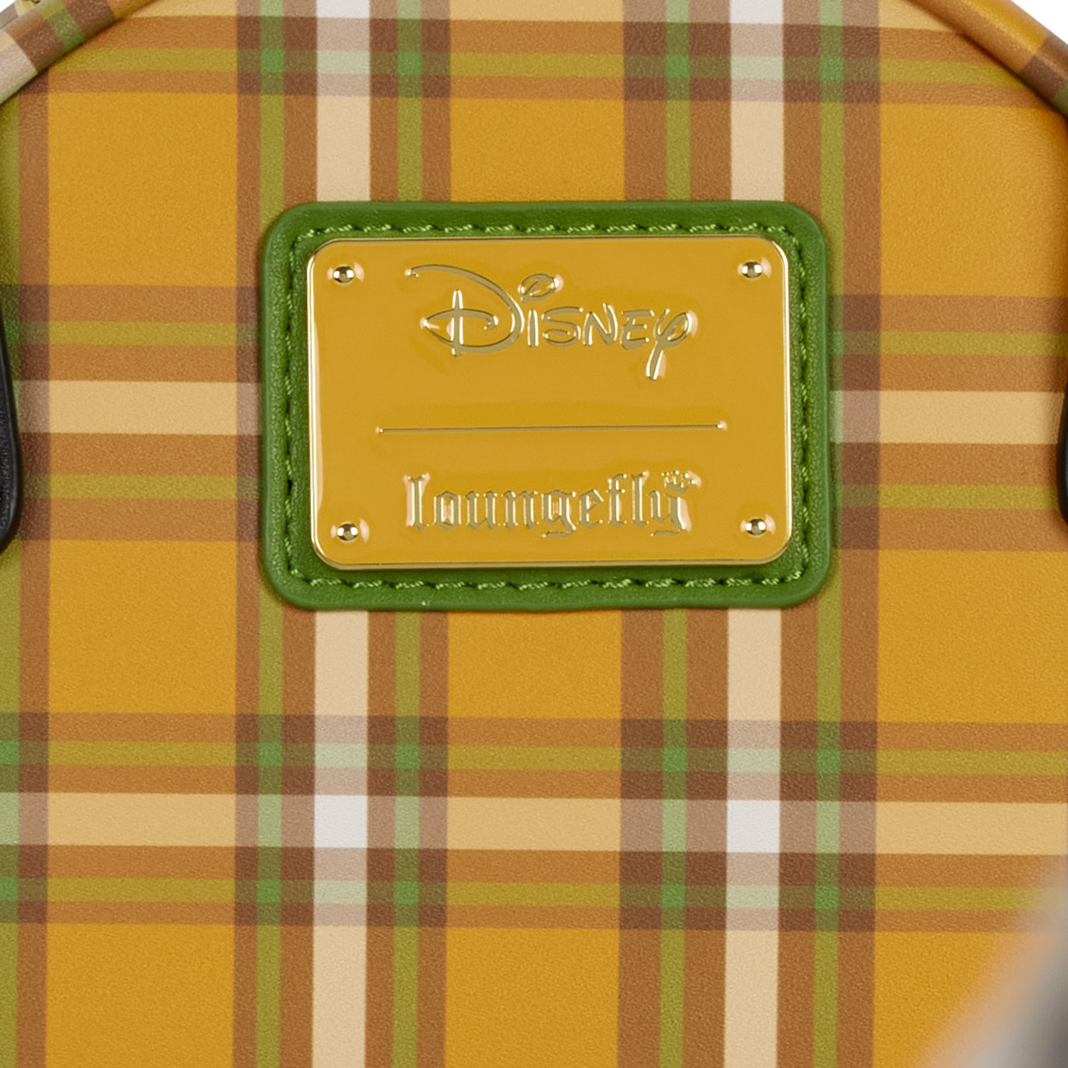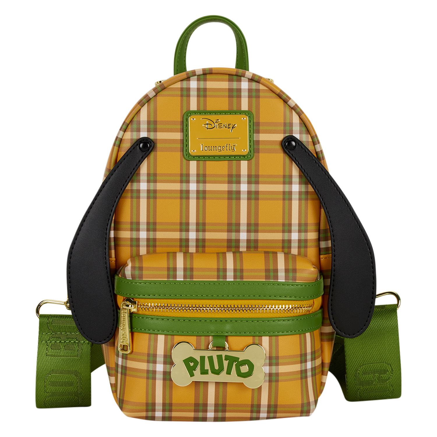 This sling features a yellow plaid pattern with adorable details like an enamel charm that says "Pluto", 3D ears that move up and down on a rivet, and a coin bag that says "Pluto" on it. The crossbody strap says ""Good Boy"" all over it.