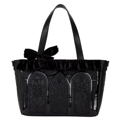 This tote bag is the Disney Villain fashion statement you've been looking for. This bag features a velvet ruffle along the top. Below, you'll find stained-glass-style windows with 3D embroidery that depicts your fav Disney Villains. Metallic faux leather and a velvet bow bring the whole look together.