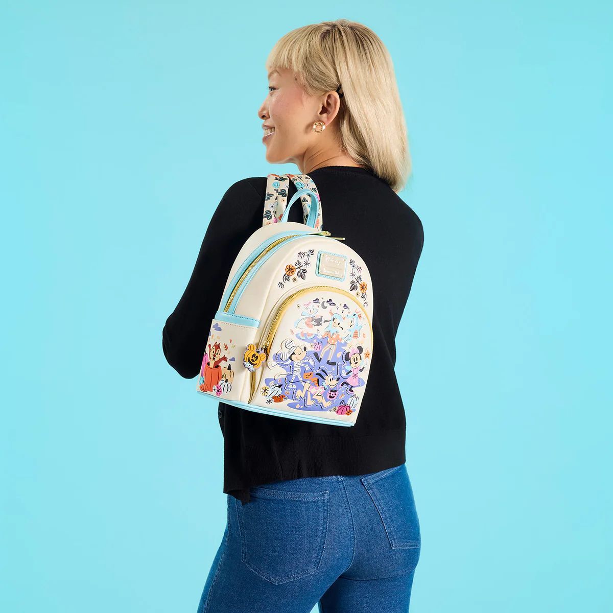 Halloween season calls for some Mickey & Friends style! This mini backpack features some of your favourite Disney characters in their Halloween costumes trick-or-treating. Cute autumn motifs like ivy and pumpkins can be found above the front pocket, on the side pockets, and along the straps.