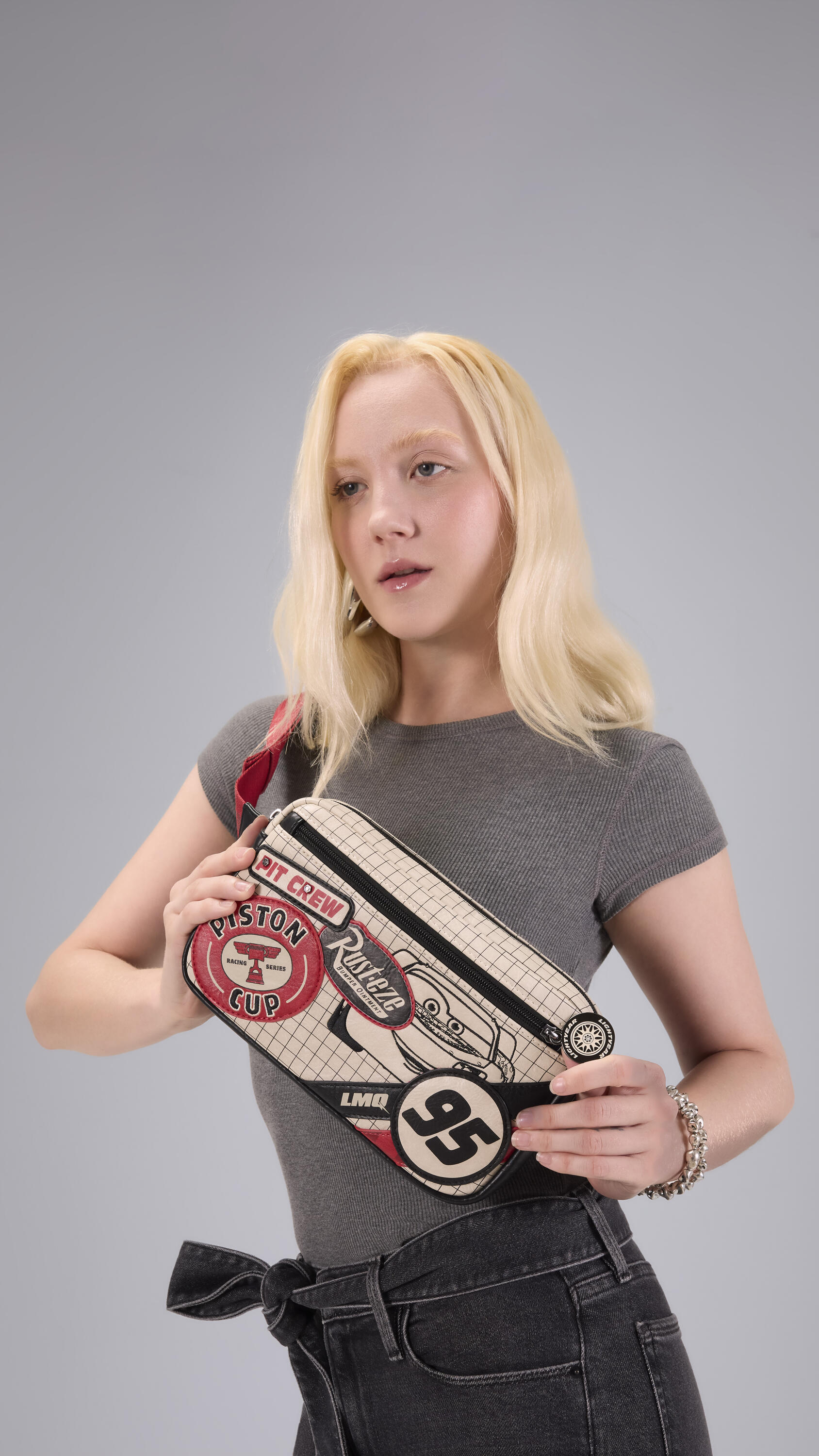 This sling bag features weathered faux leather, molded metal studs, and embroidered details that look like stickers on the front. You'll find "stickers" that say, "Pit Crew," "Rust-eze," "Piston Cup," and more! This bag is a really fun accessory that's both stylish and a great way to celebrate one of your favorite movies!