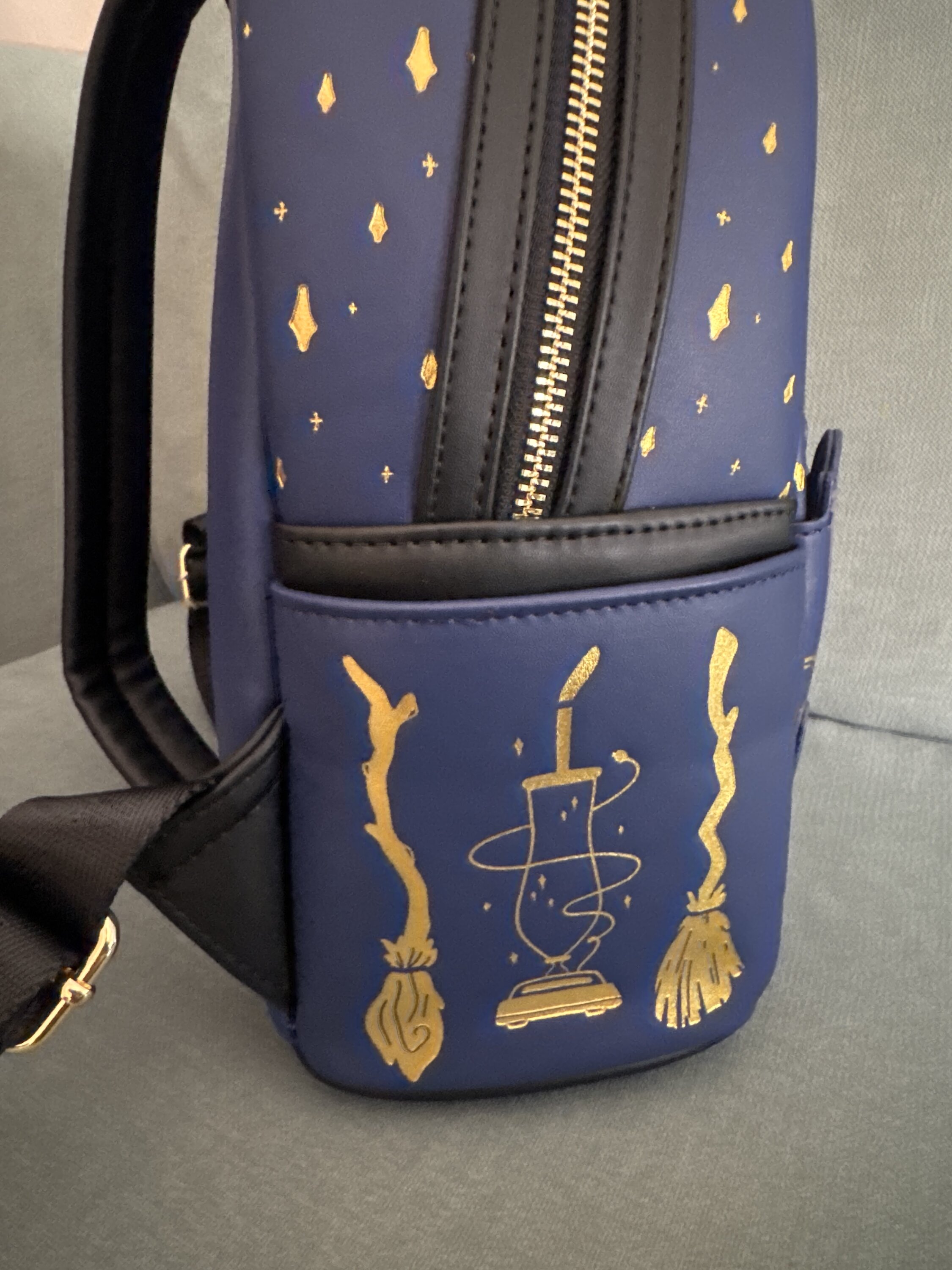 This mini backpack features the Sanderson sisters from Disney's Hocus Pocus. They dance together under a starry sky in a graveyard. Binx pops up from behind a headstone! On the side pockets, you'll find gold foil details of each of their brooms.