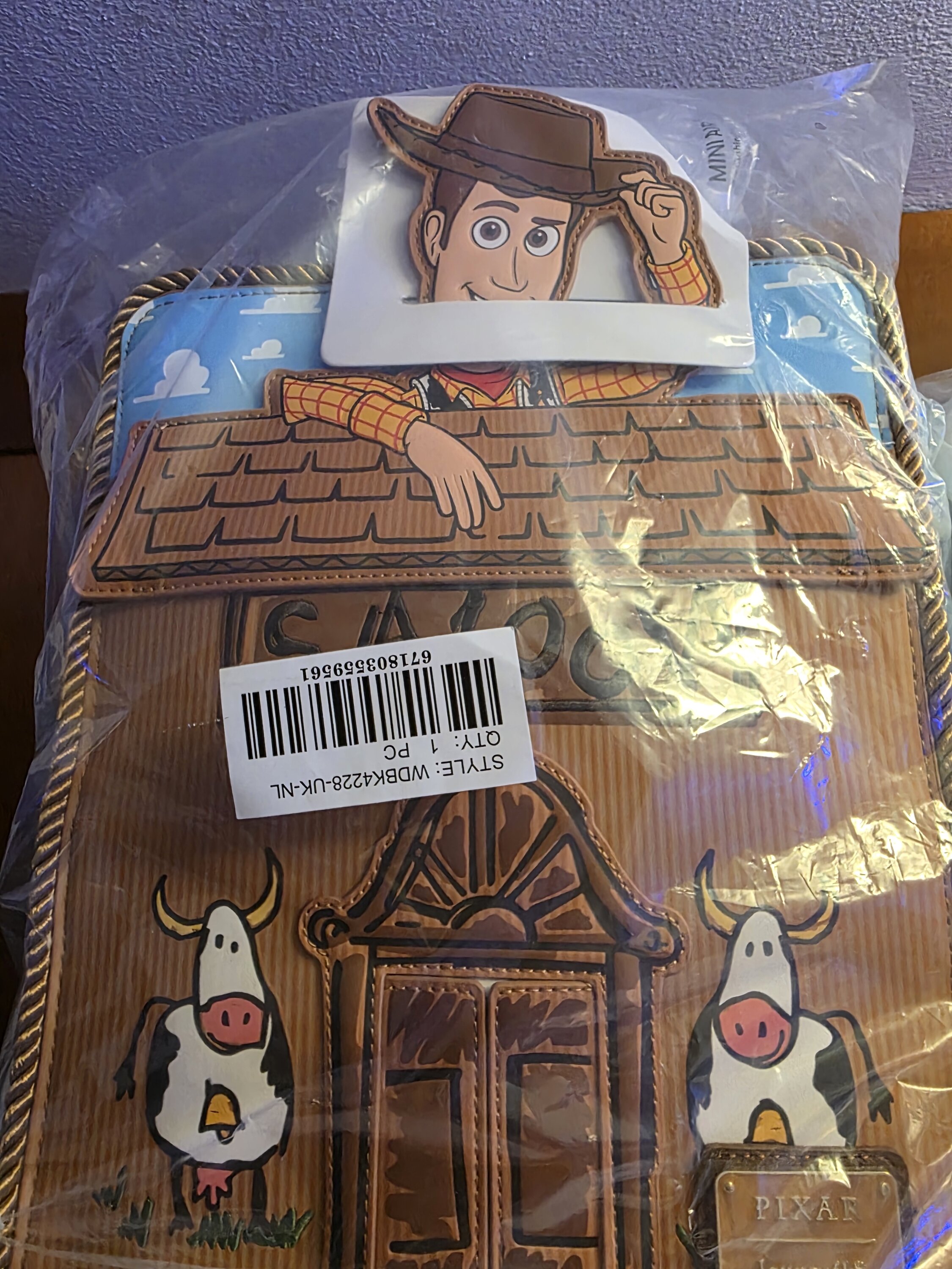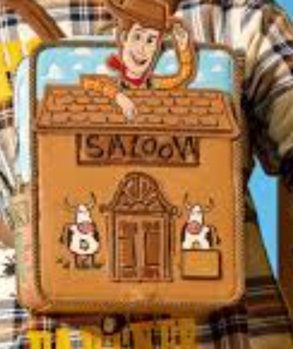 This mini backpack looks like Woody's saloon made from a cardboard box. You'll find Andy's handwriting labeling the ""Saloon,"" ""Bank,"" and ""Hotel."" Real rope details and cowboy faux leather make it extra fun. Plus, Woody leans over the top of the saloon! The front doors of the saloon open to reveal a wanted poster.