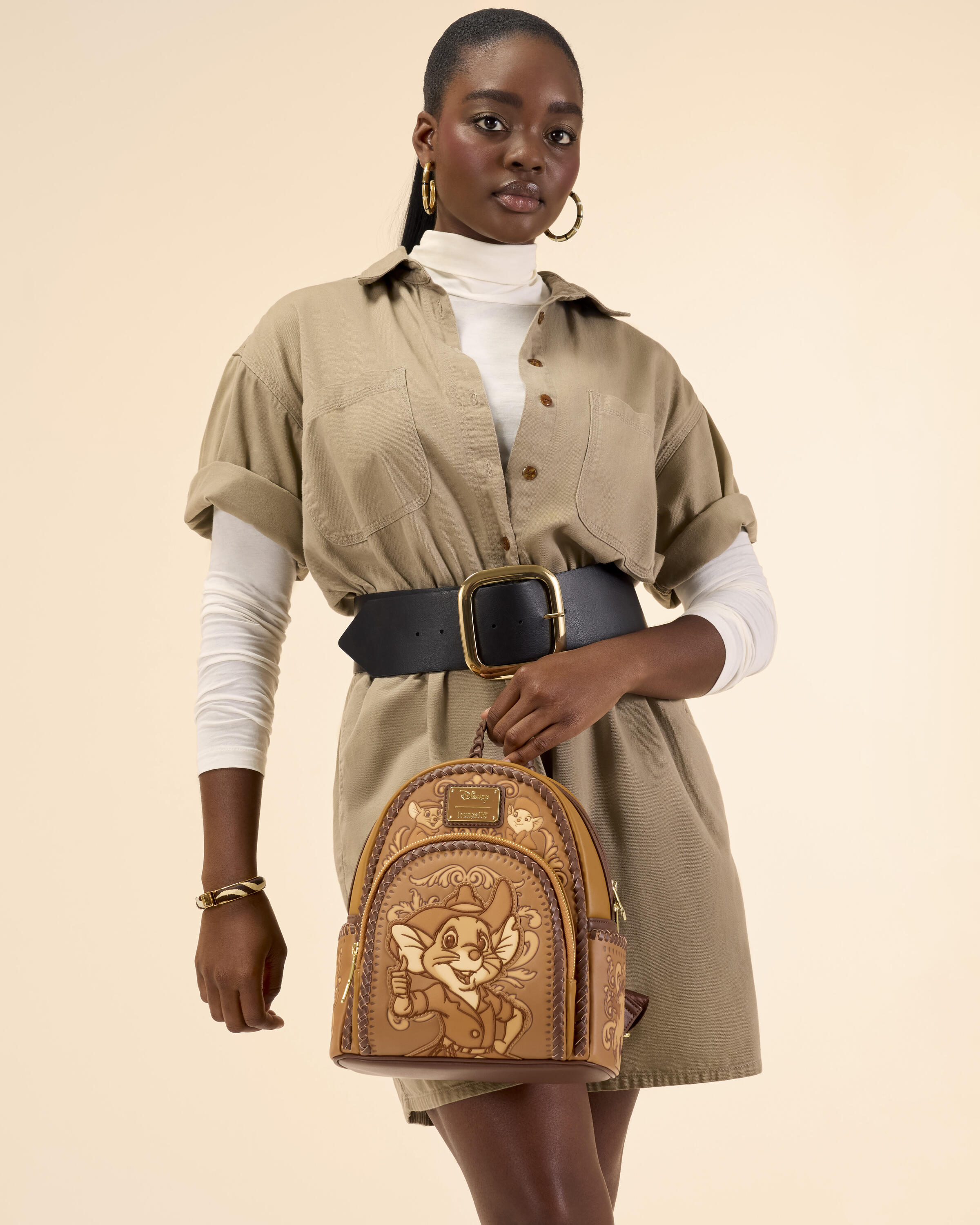 This mini backpack is inspired by Disney's Rescuers Down Under. You'll find Jake front and center on the front pocket in debossed and applique detail. Bernard and Miss Bianca can be seen above the front pocket. More animal friends are visible on the side pockets. Cowboy faux leather and a braided top handle bring this look together.
