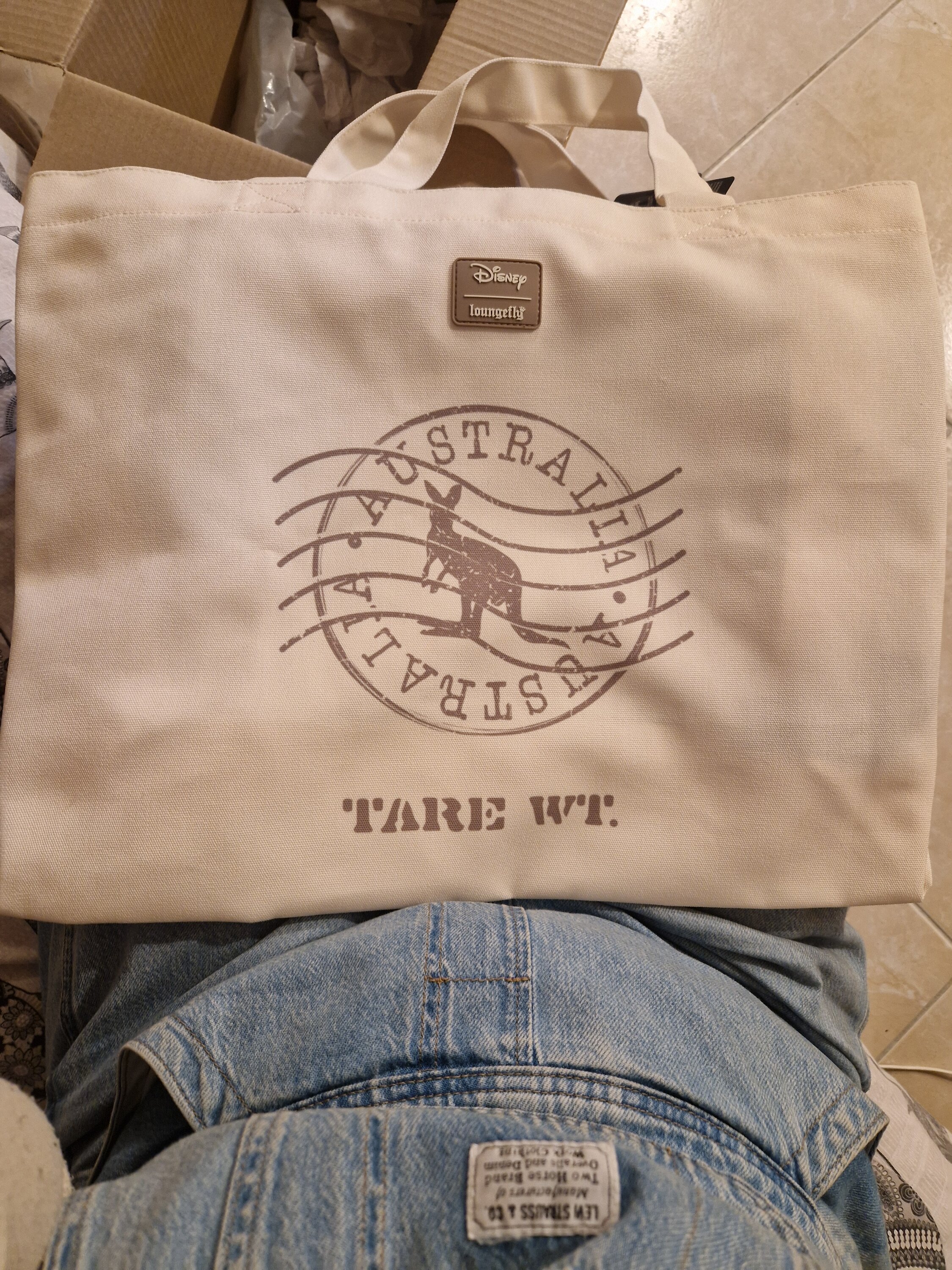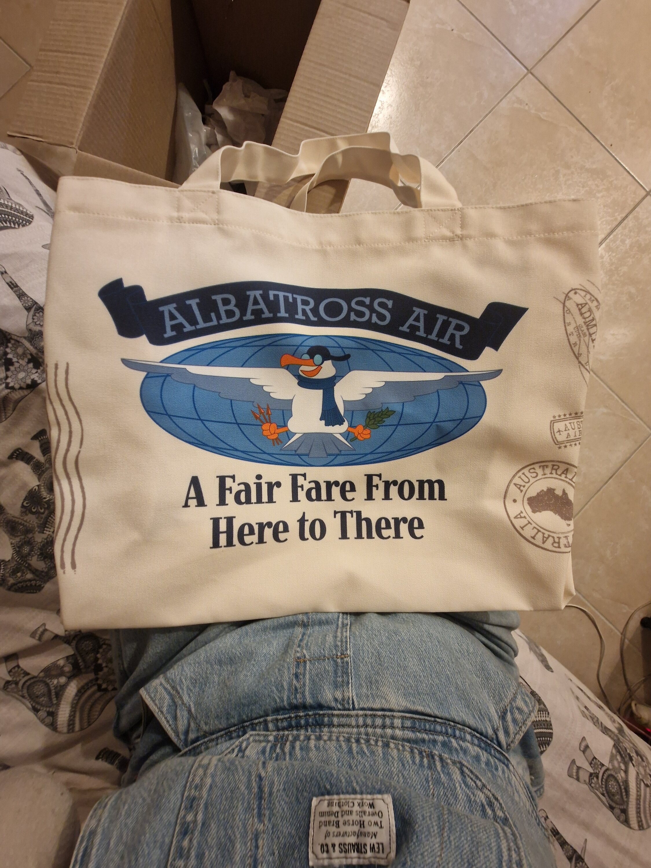 This canvas tote bag pays homage to Disney's "Rescuers Down Under" and features the Albatross Air logo. You'll find an Albatross symbol in front of a globe. Above is a banner that reads, ""Albatross Air"" and below it says, ""A Fair Fare from Here to There."" Along the side you'll see ""Express"" and other symbols ""stamped"" on the bag. Turn it around to find another Australia ""stamp.""