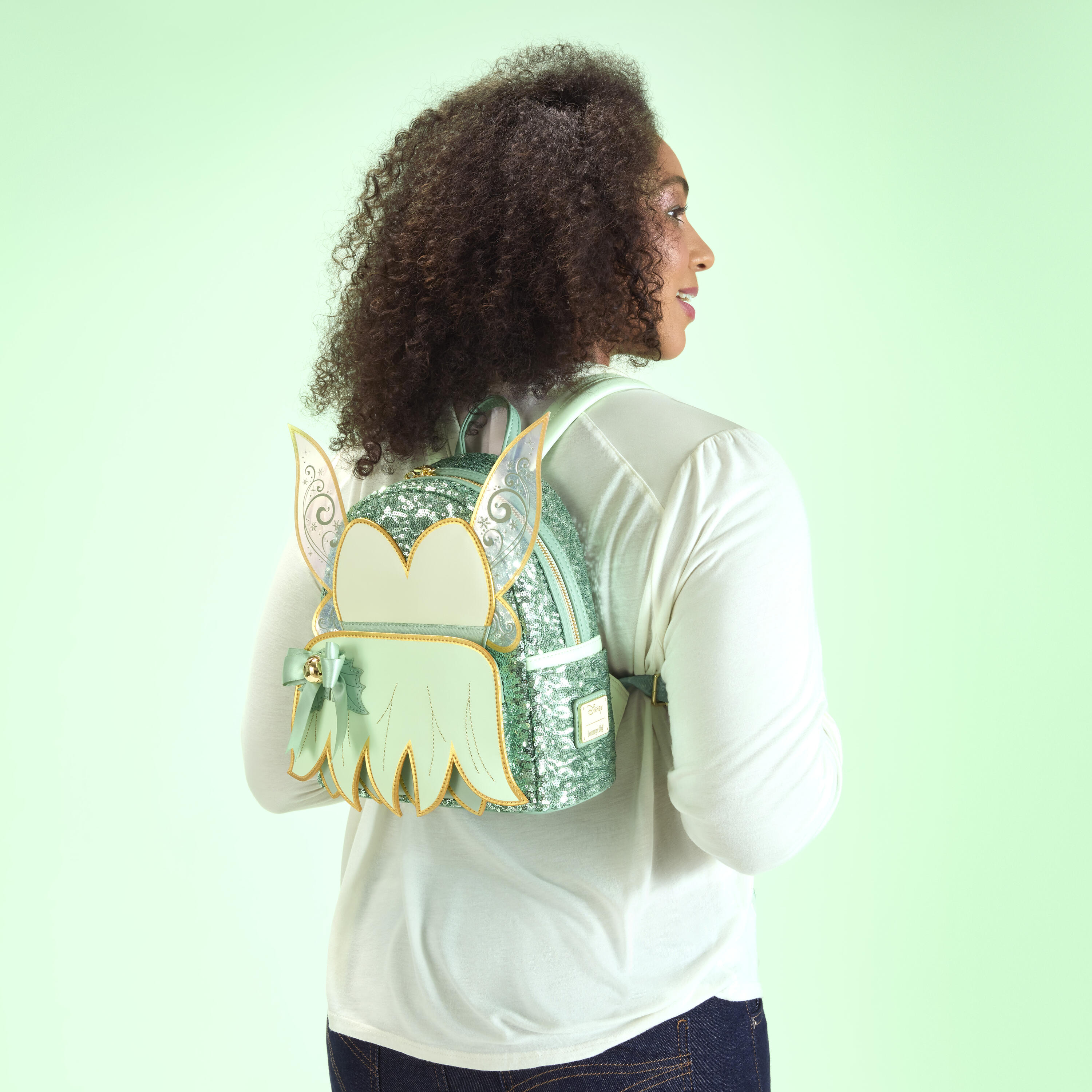 This sequin mini backpack features Disney Tinker Bell's dress over the front. You'll find stunning details like gold edge paint, a satin bow, and a real bell! PVC wings extend over the sides of the bag with embossed details.