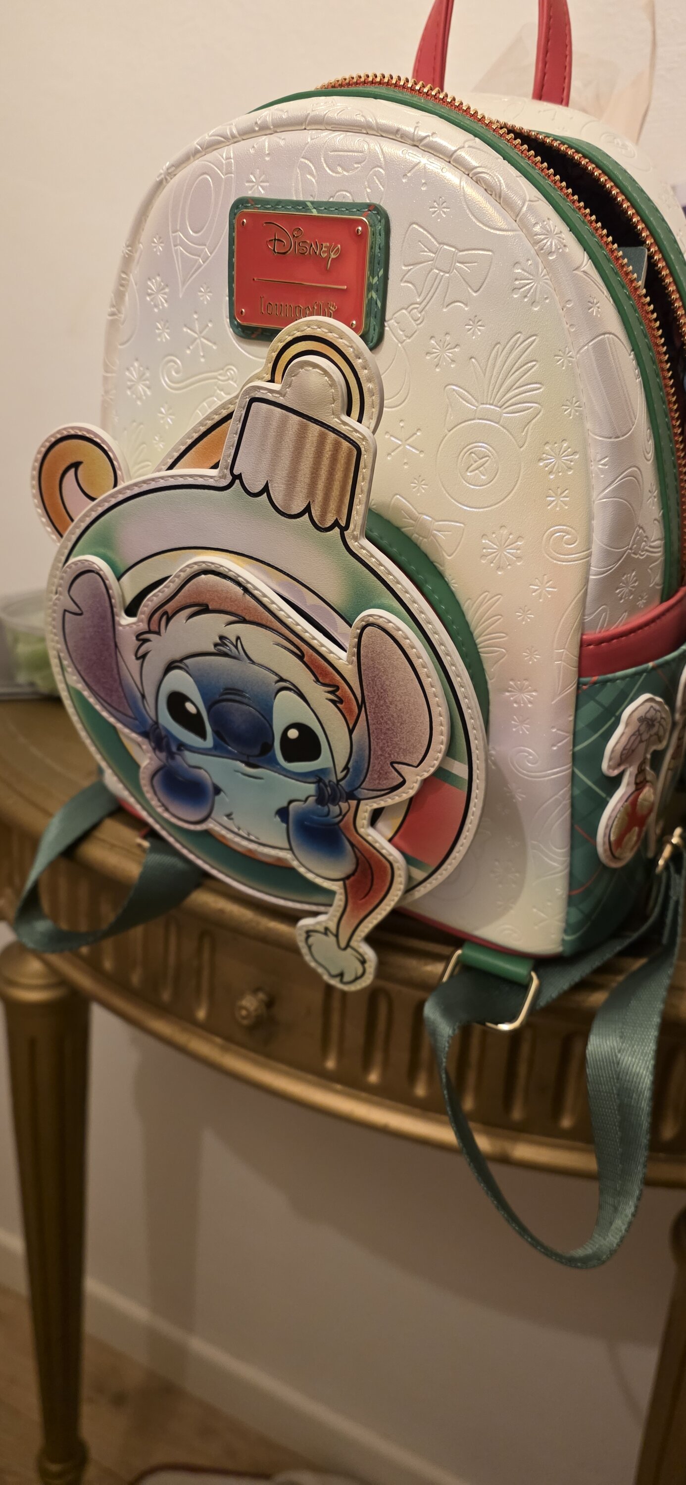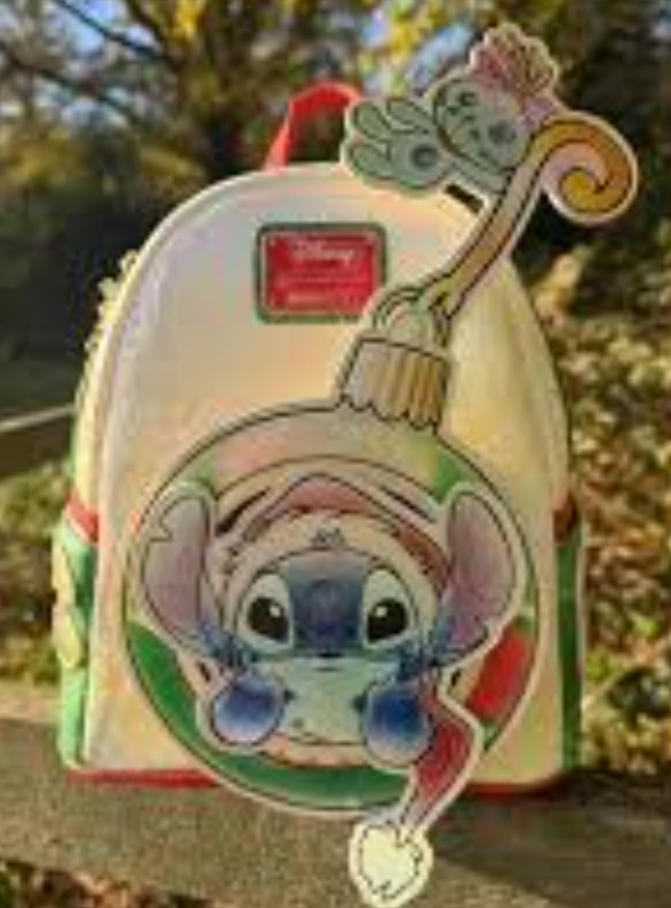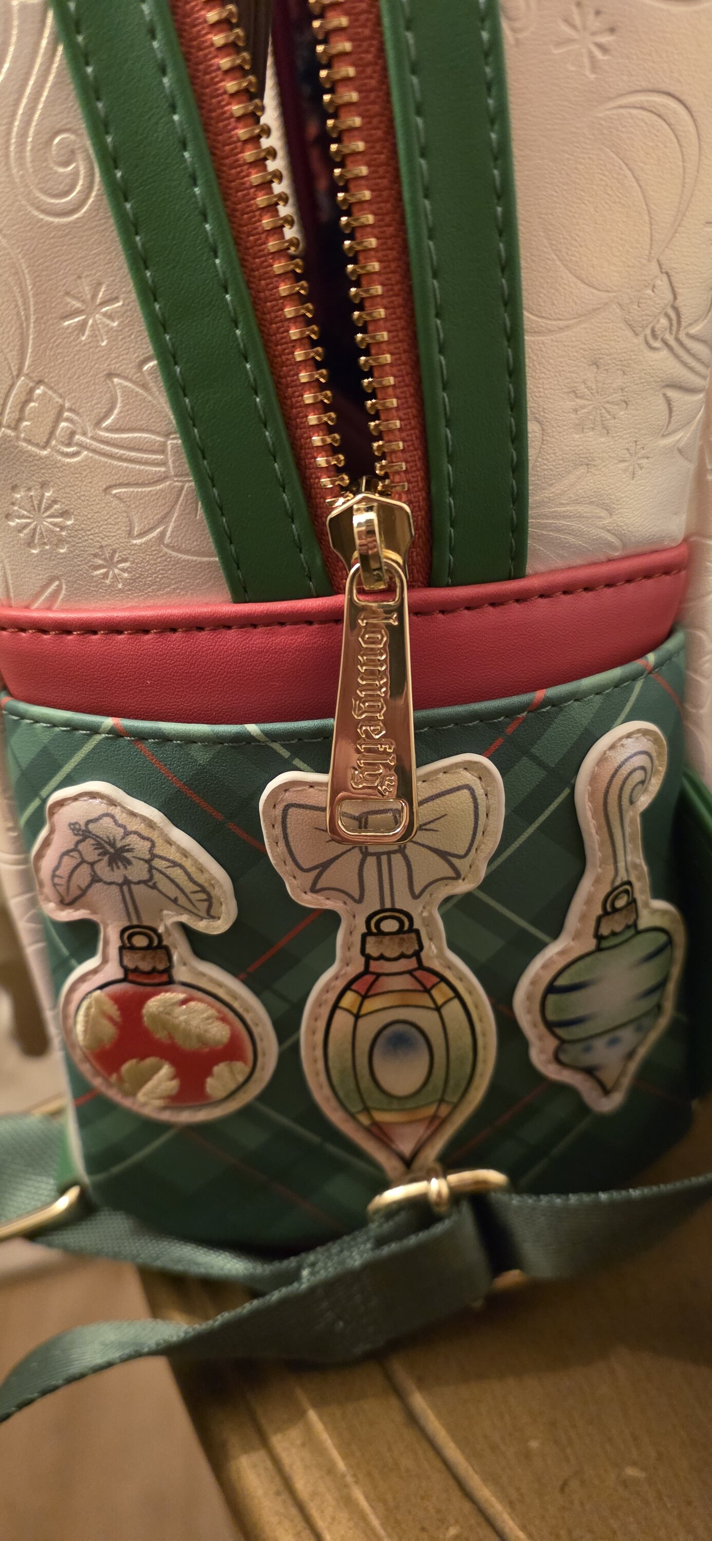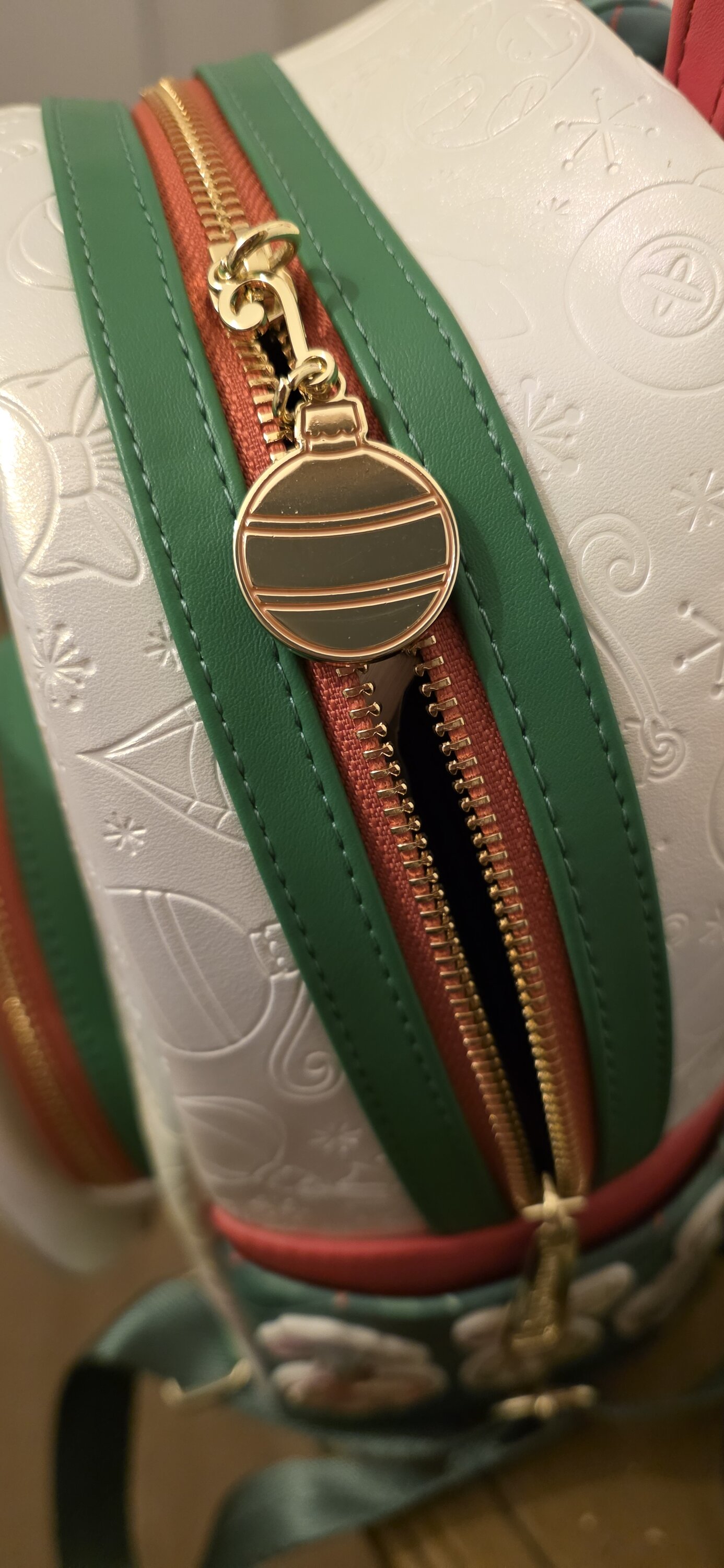 This mini backpack is ready to celebrate the holidays! You'll find Stitch peeking out from an ornament over the front pocket. Scrump hangs onto the hook of the ornament and can move back and forth! Over the rest of the bag, you'll find ornament designs all over against a pearlescent background. The plaid straps bring the whole look together!