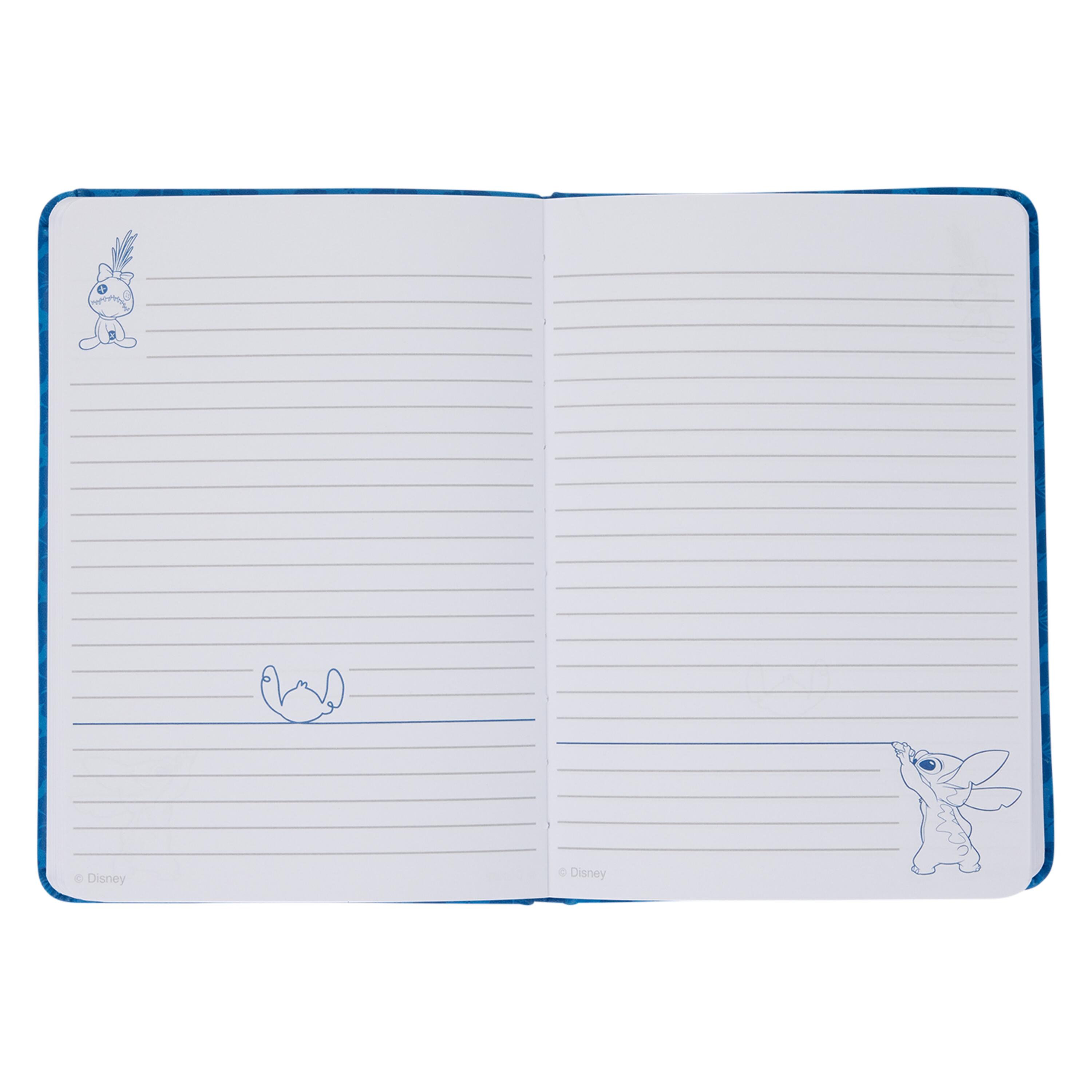 Stitch ""bursts out"" from the front of the notebook. Behind him is an all-over print of hibiscus flowers. Turn the journal around to find ""This Book Belongs to Stitch"" written on the back. Inside, you'll find lined pages featuring images of Stitch and Scrump!