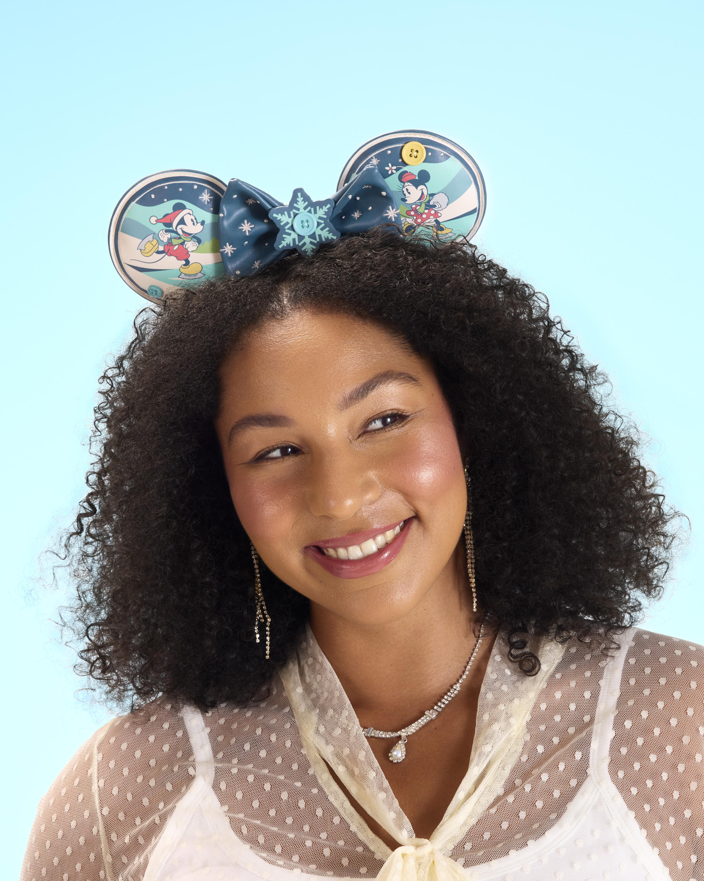 This ear headband features Mickey and Minnie ice skating. You'll find a removable bow between the ears, featuring a snowflake charm in the center and stars on the bow. Turn it around to find a quilted pattern on the back of the ears featuring evergreen trees.