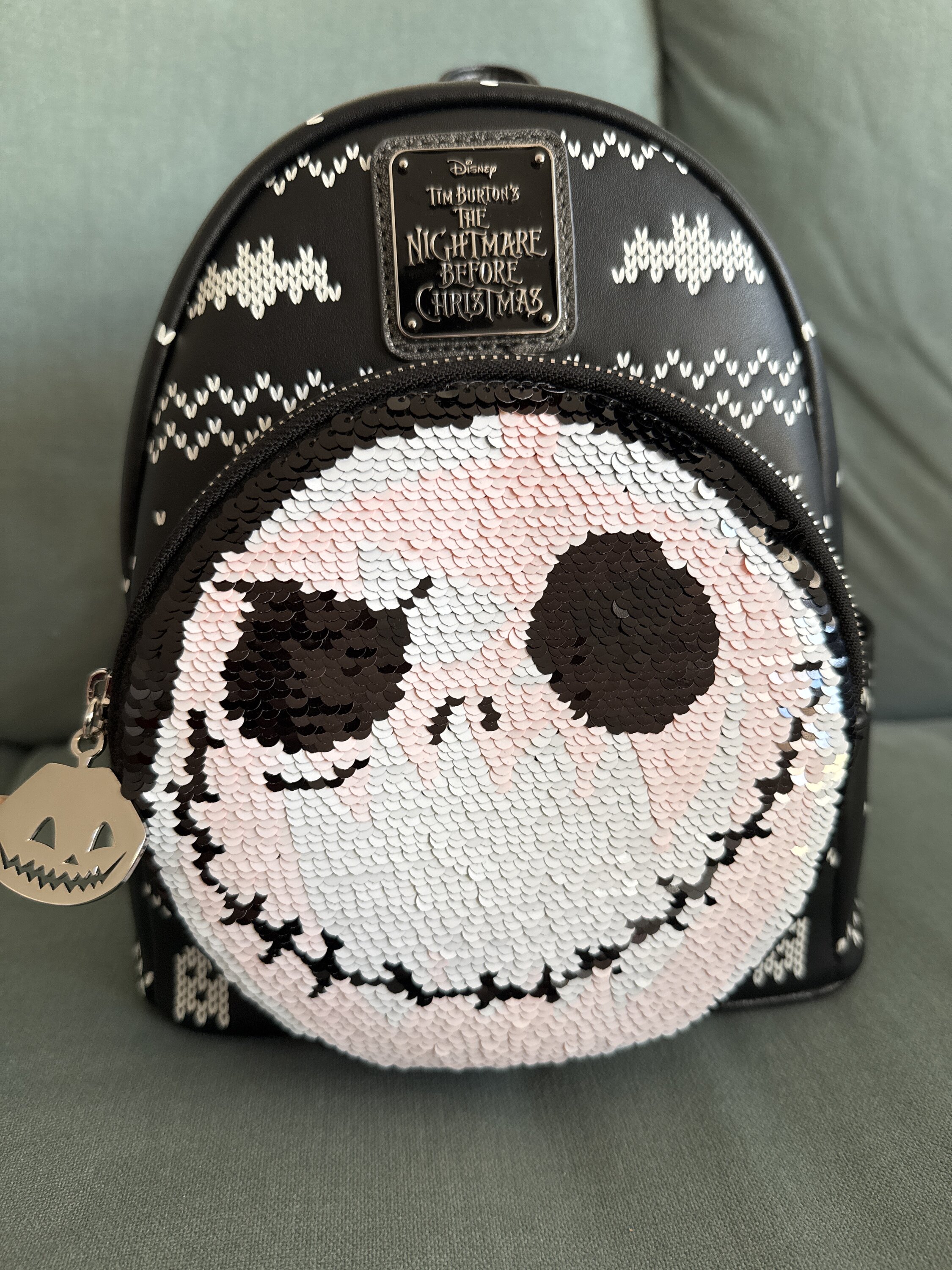 The body of the bag has a design similar to a holiday sweater, with pumpkin and ghost designs. The front pocket features reversible sequins. From one view you can see Jack Skellington and the other you can see a jack-o'-lantern! It's a super cute go-to bag for anyone who loves all things The Nightmare Before Christmas.
