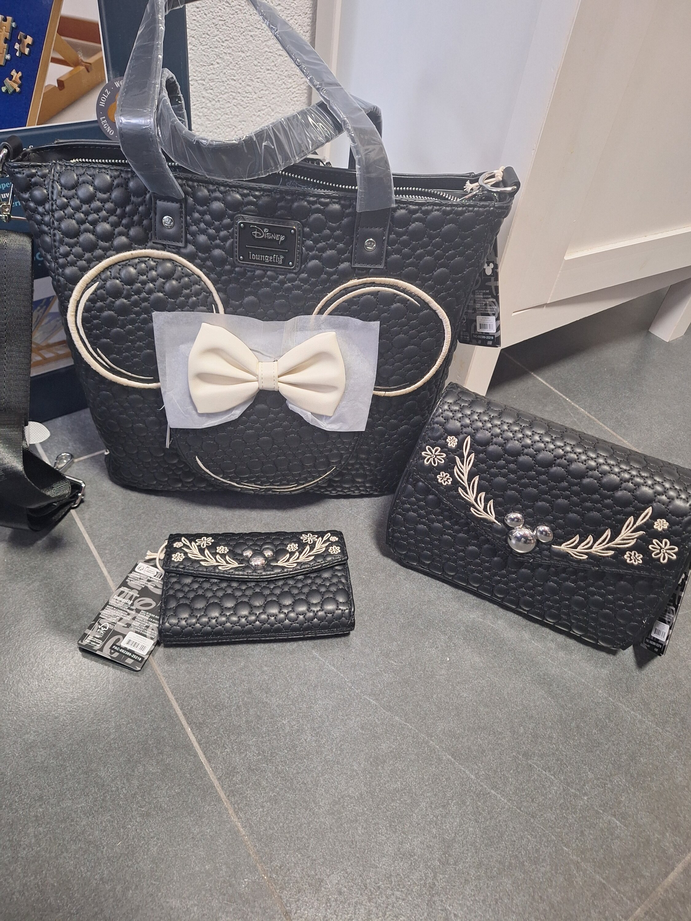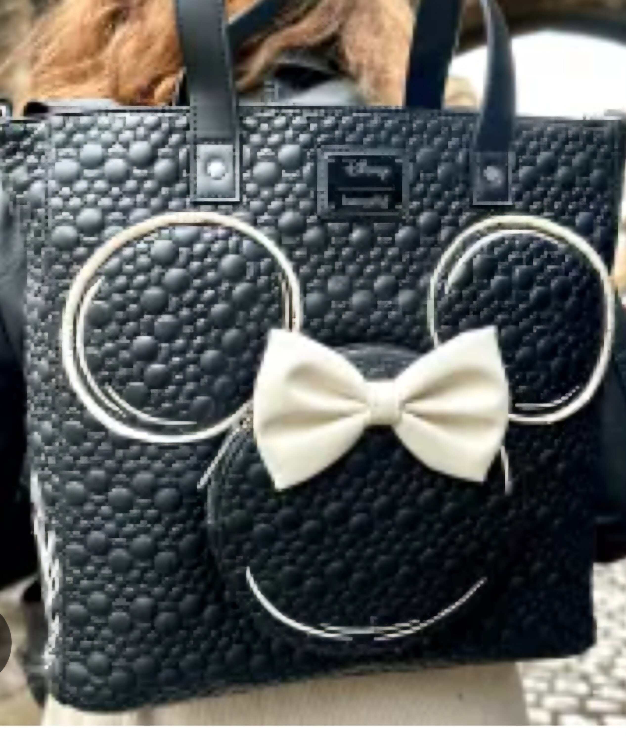 This bag converts between a backpack and a tote bag. All over, you'll find a quilted pattern of Mickey Mouse silhouettes. The front pocket looks like Minnie Mouse's silhouette "sketched" on the bag. It has a 3D bow! You'll find embroidered flowers and leaves along the side.