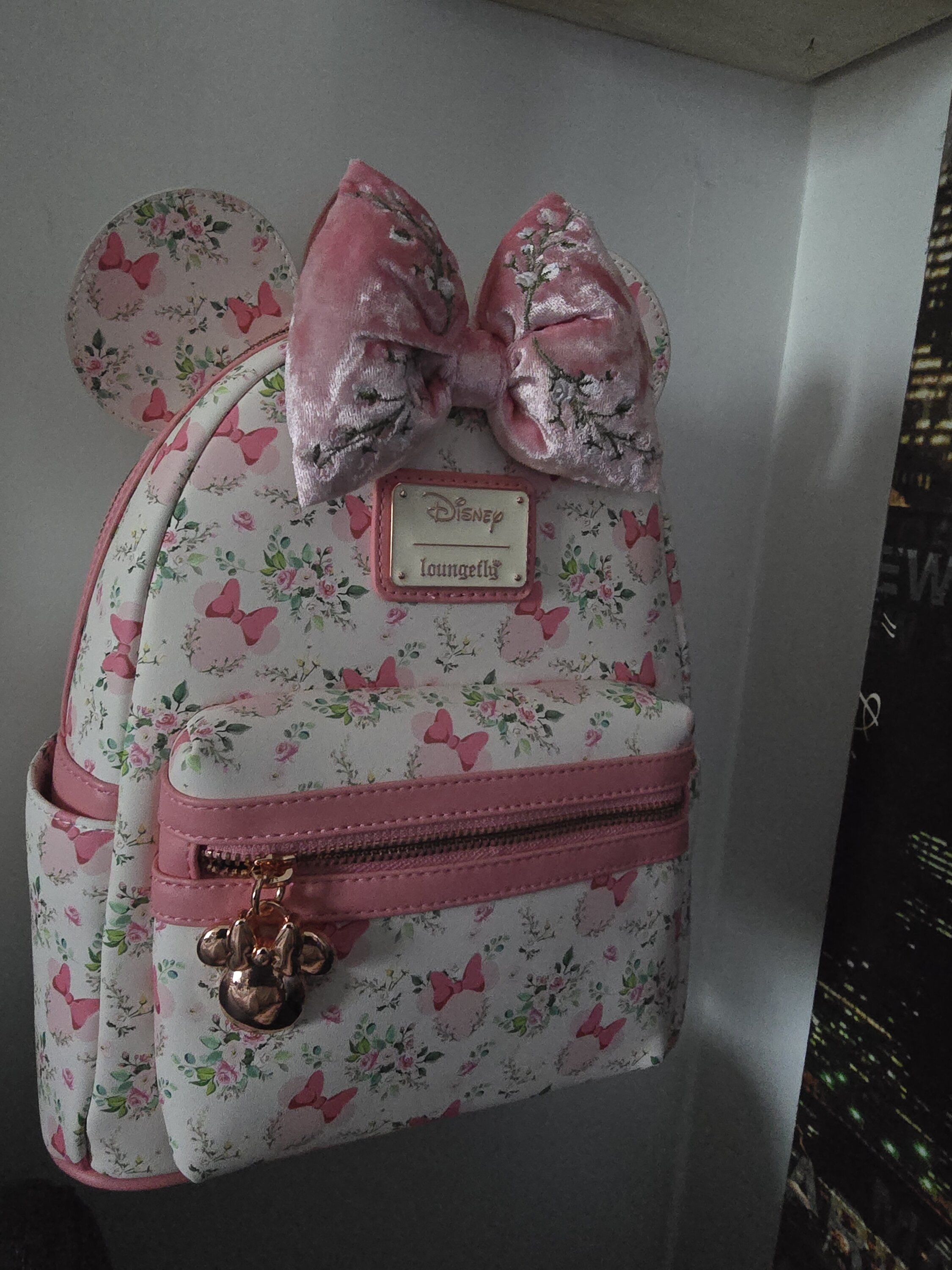 This mini backpack is inspired by Disney's Minnie Mouse! You'll find 3D applique ears with a velvet bow in between. All over the rest of the bag, you'll find a repeating pattern of Minnie Mouse silhouettes surrounded by floral designs. Pink straps bring the whole look together.