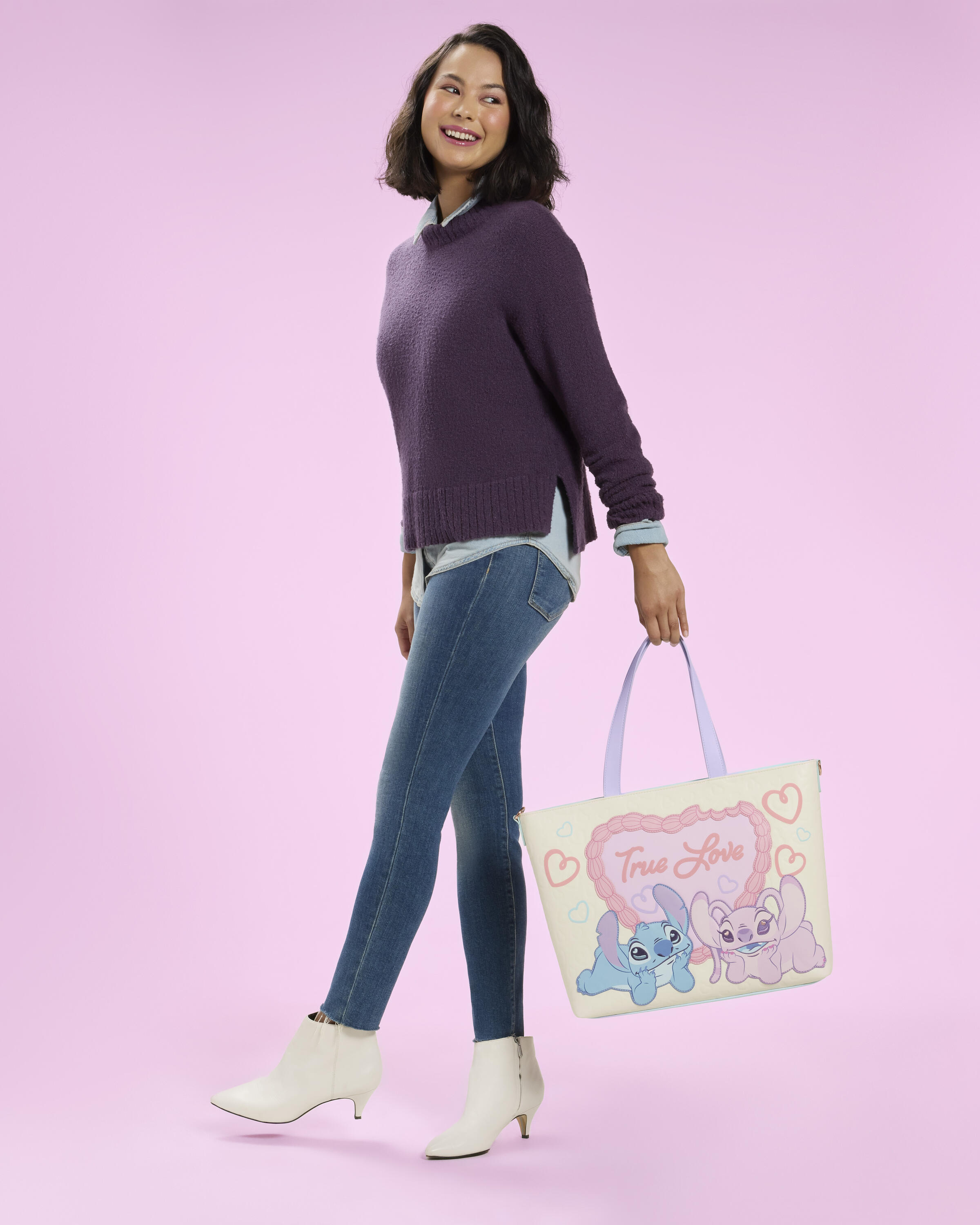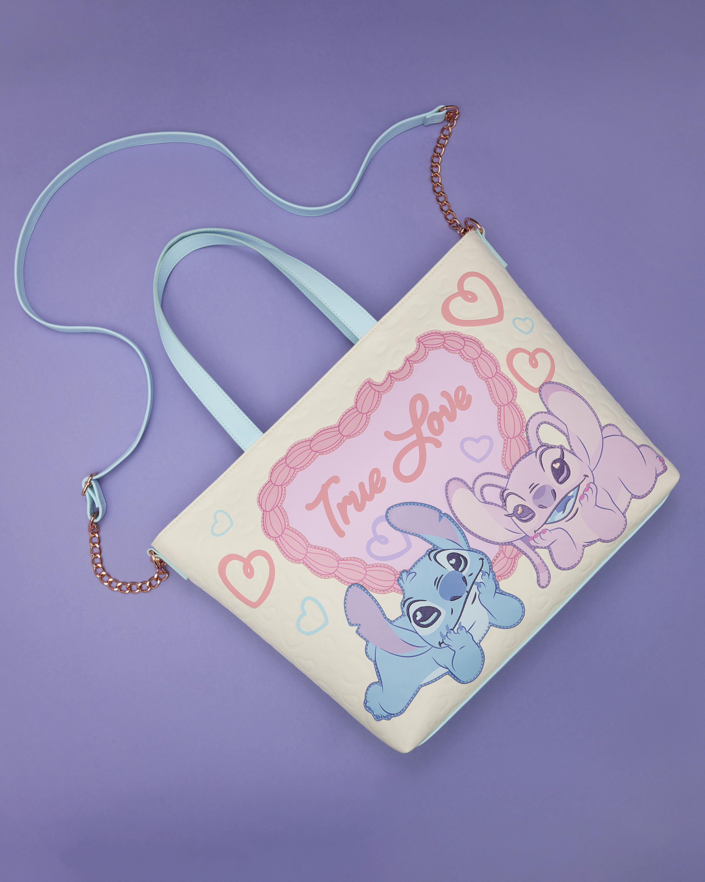 This tote features Stitch and Angel on the front. Behind them is a heart-shaped cake that says ""True Love."" You'll find puff print hearts on the front and back, as well as a debossed heart pattern all over. There's also a strap to wear it crossbody if you'd like.